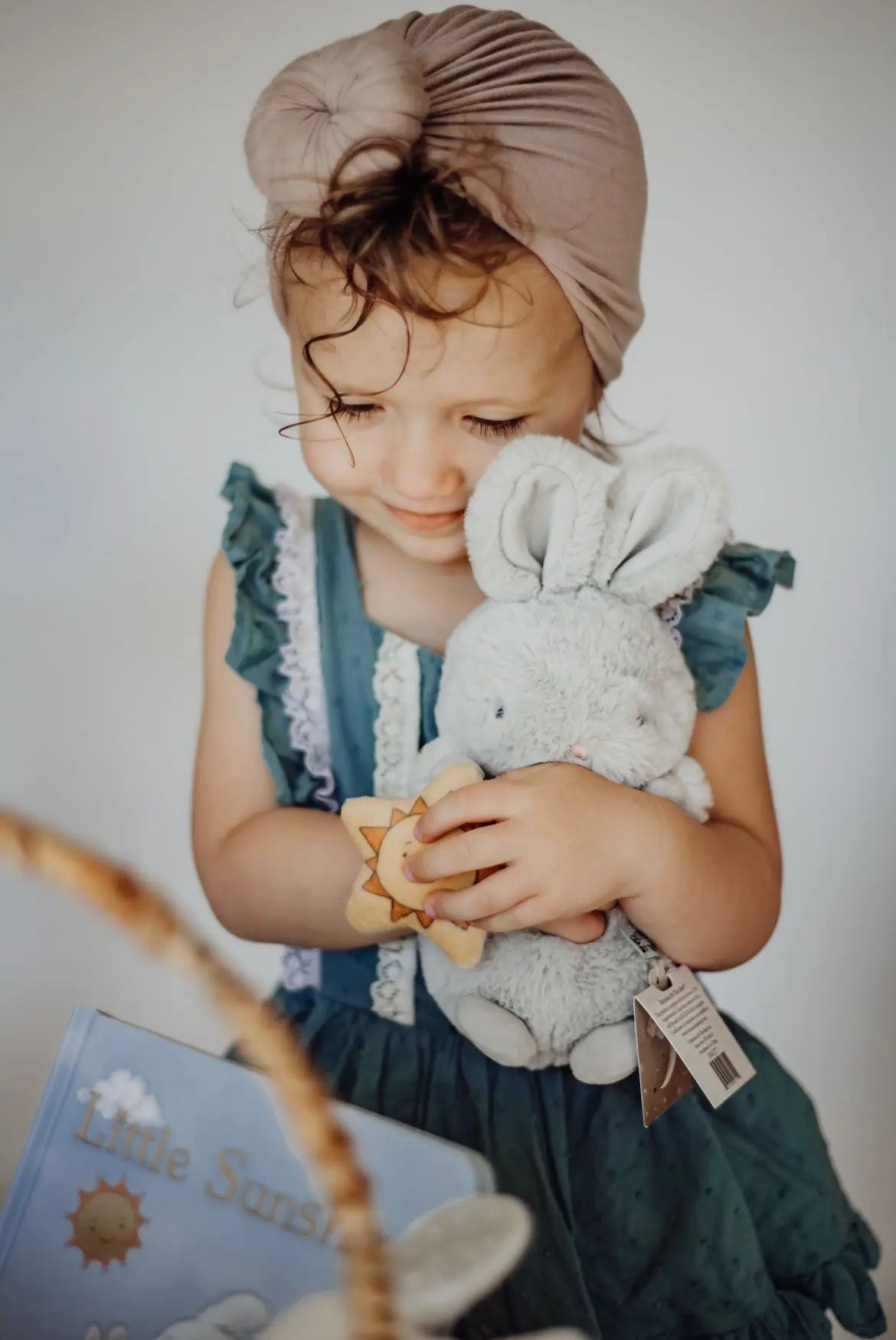 Sweet Bloom stuffed animal Bunny is ready for day or night, holding a bright yellow reversible sun and star accent toy, perfect for little hands to play and soothe with! Super soft grey nibble fur with velour features, and sweet embroidered details.