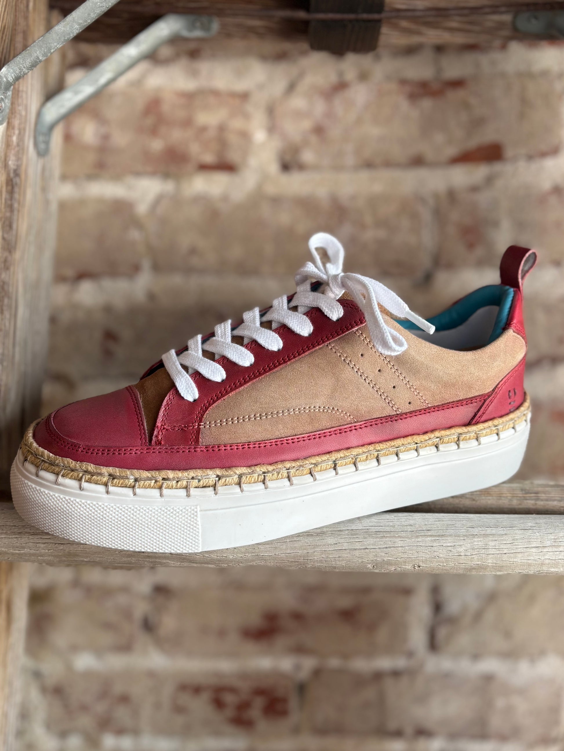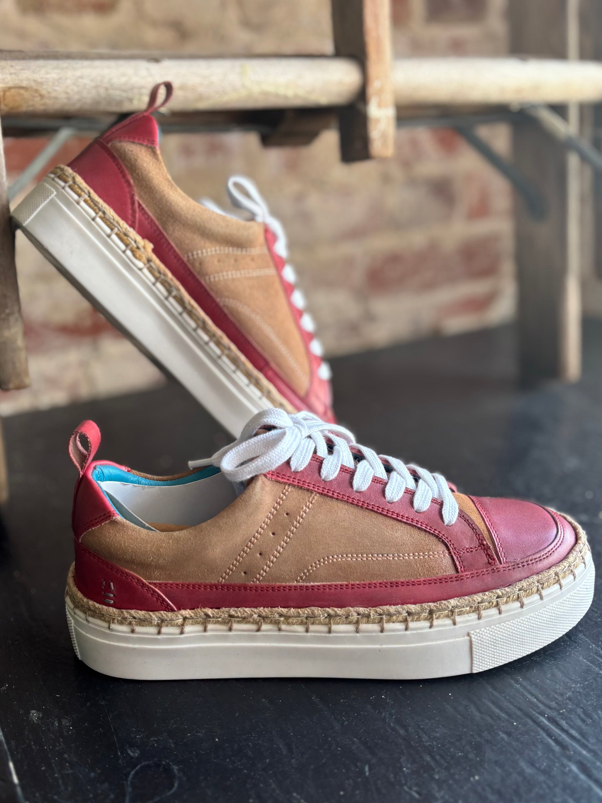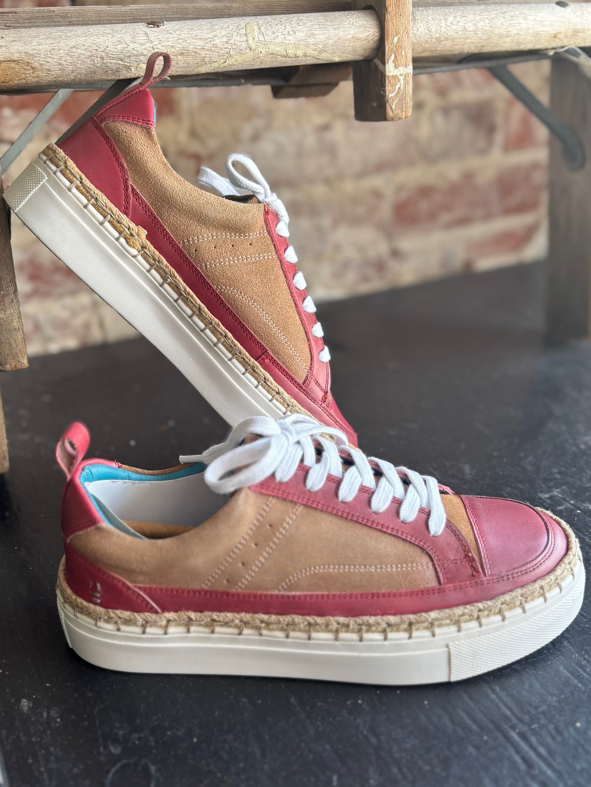 Loving this new red & tan sneaker! Step into style and comfort with the this sunset coral lace-up sneaker featuring a thermal rubber outsole for lasting grip and durability, while the leather lining and cushioned insole provide all-day support. Made from a mix of leather, suede, and jute, this versatile sneaker adds fun & texture to any outfit.