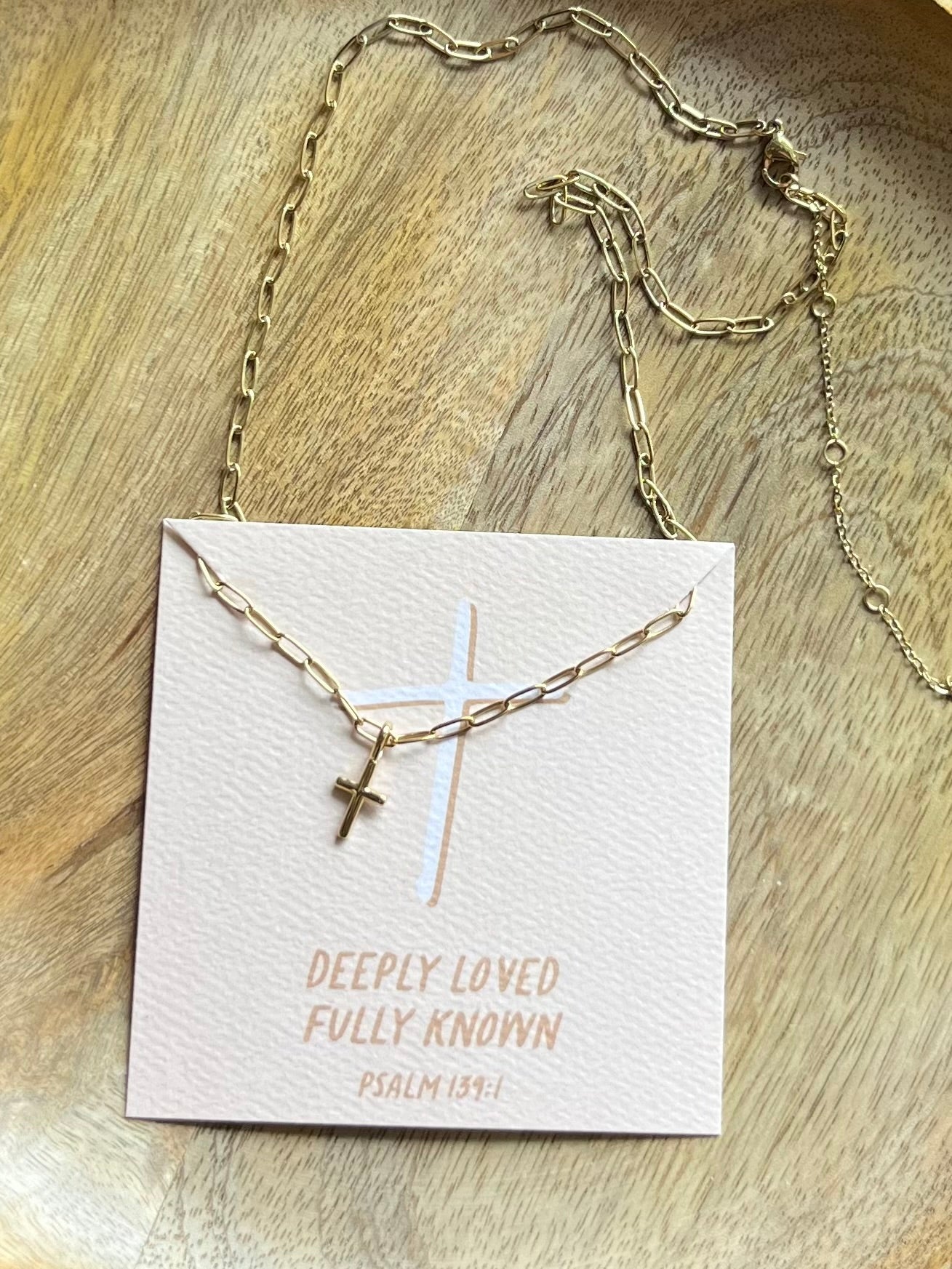 Details: Cross Charm on a 16-18" mini paperclip chain 14kt Gold Plated Tarnish + Water Resistant Hypoallergenic
