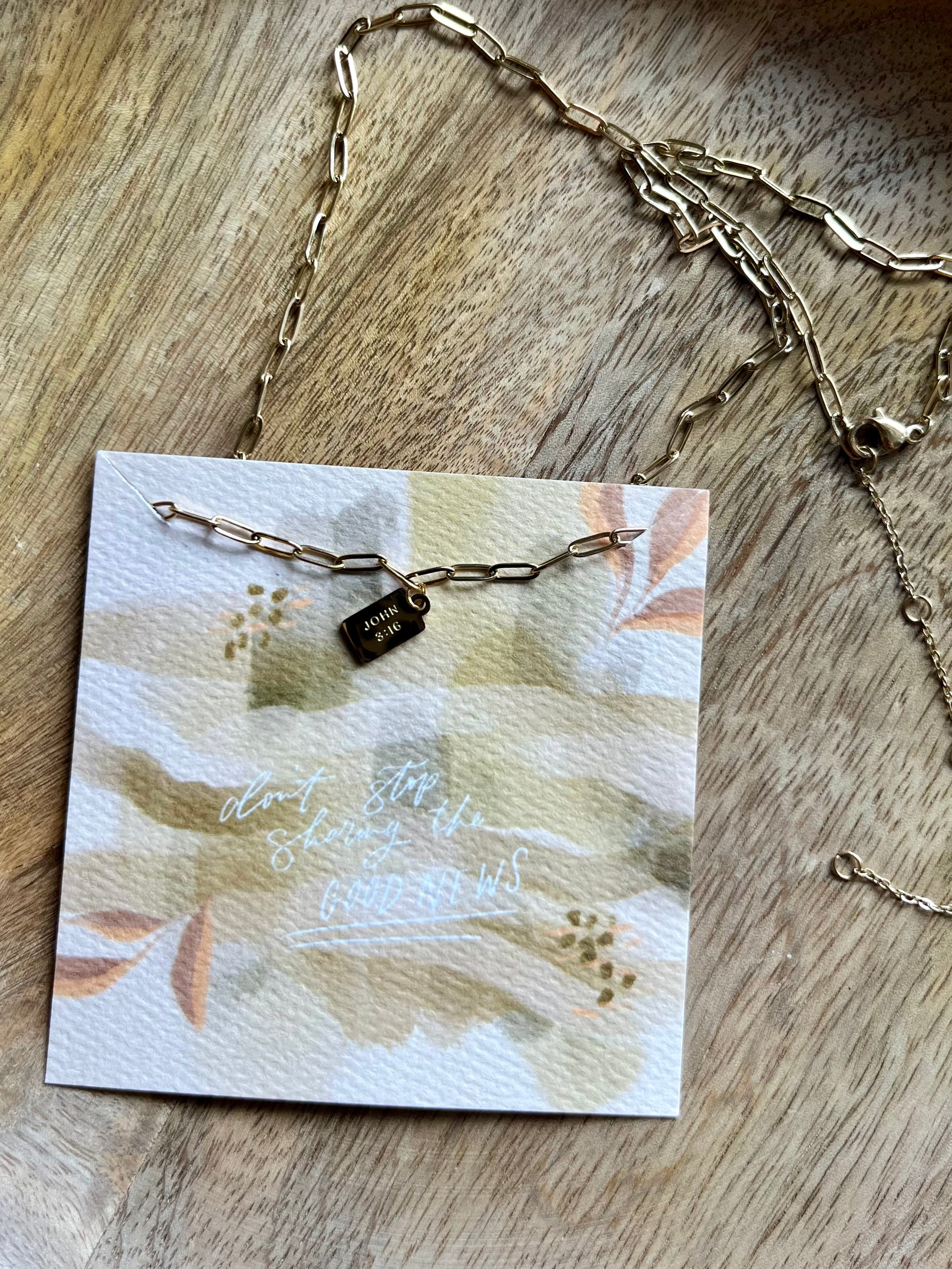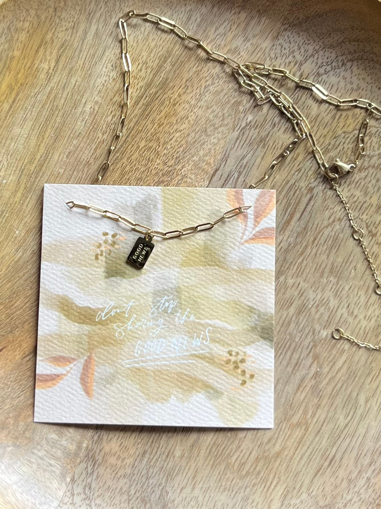 Double-sided tag on dainty paperclip chain Tag size: 5x7mm Adjustable 16-18" 14kt Gold Plated Hypoallergenic Tarnish + Water Resistant