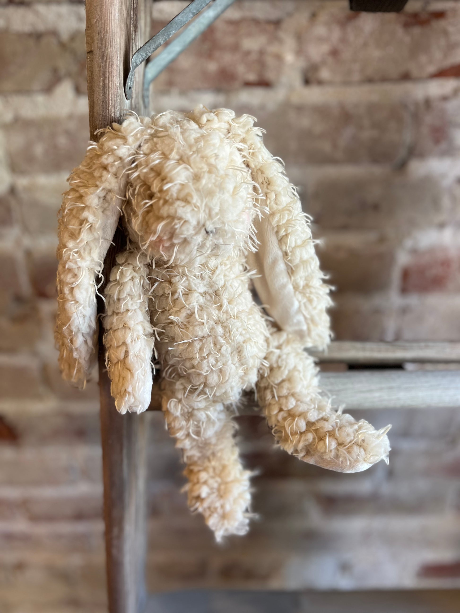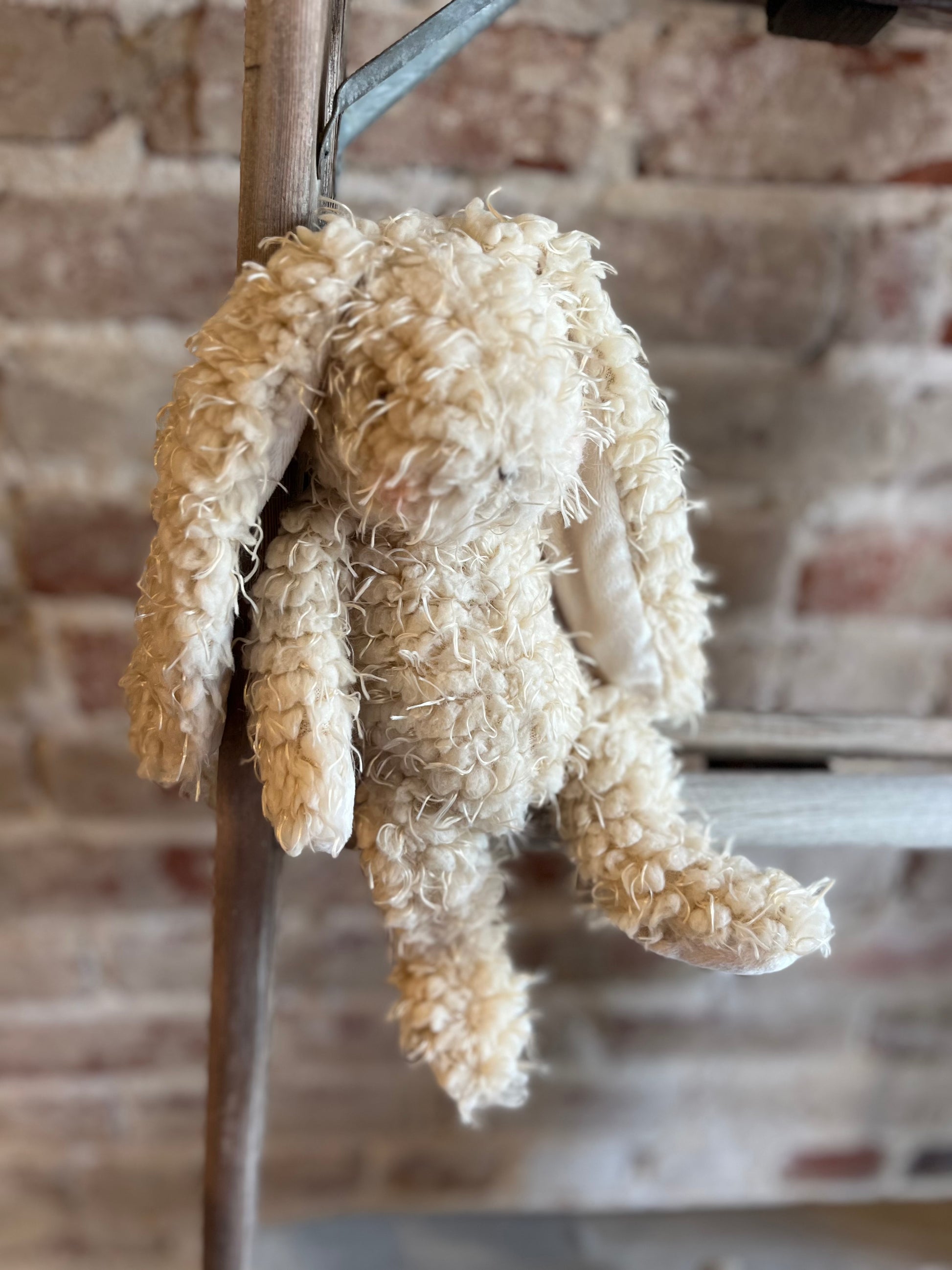 Hiding under a bush? Oh, no, not Harey the Bunny Rabbit -- he’s one of the stuffed animal gang. Warm almond scraggly fur body with handcrafted, embroidered face and a very bushy white tail. Harey is our favorite little bunny rabbit woodland friend over at Camp Cricket.