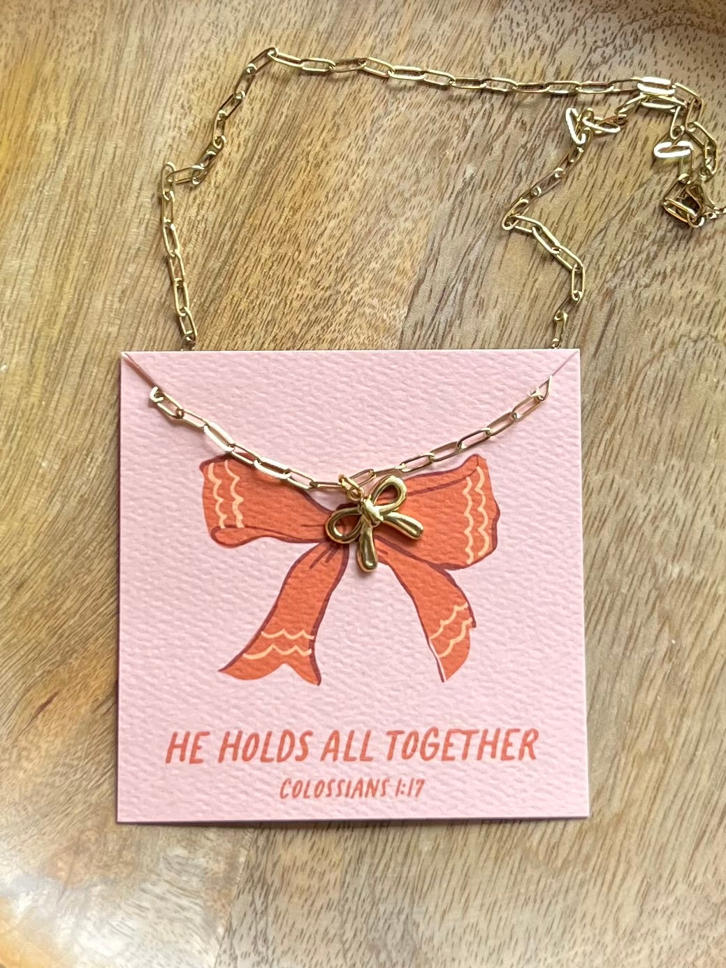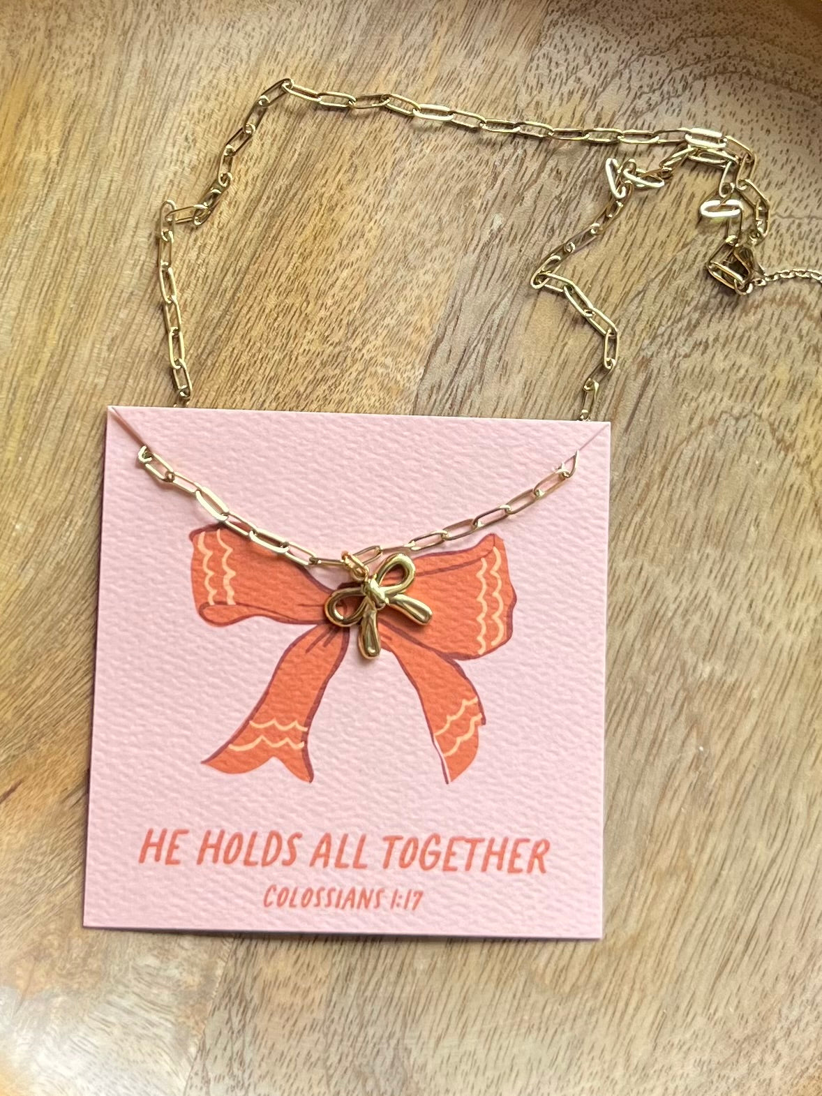Details: Bow Charm on a 16-18" mini paperclip chain 14kt Gold Plated Tarnish + Water Resistant Hypoallergenic