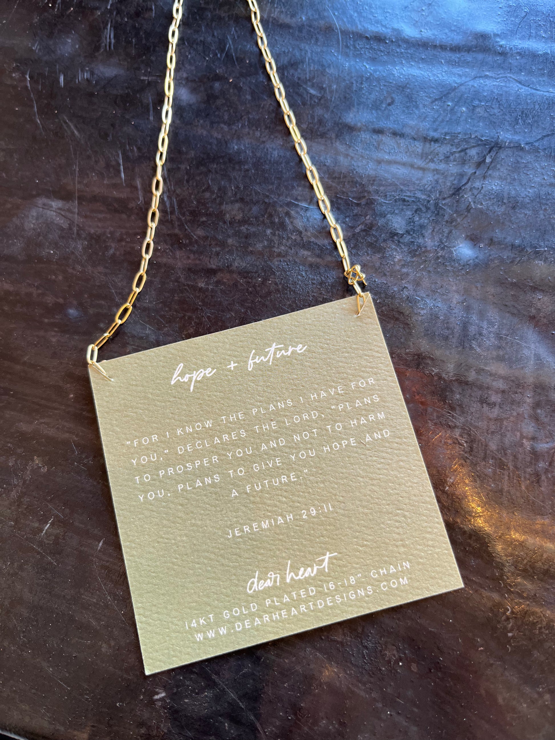 on dainty paperclip chain. One side of tag says "hope & future" the other side says "Jeremiah 29:11"