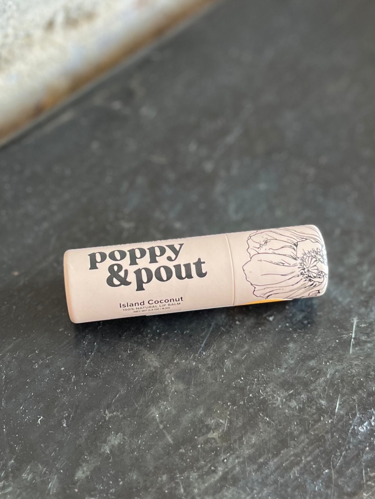 -about poppy & pout We have been making our all-natural lip care products by hand in idaho since 2014. Our lip balms are made from ethically sourced beeswax, organic coconut oil, and sunflower oil. We then add a hint of essential oils and/or natural flavor oils and a drop of vitamin e. That's it! Simple ingredients for perfectly hydrated lips.