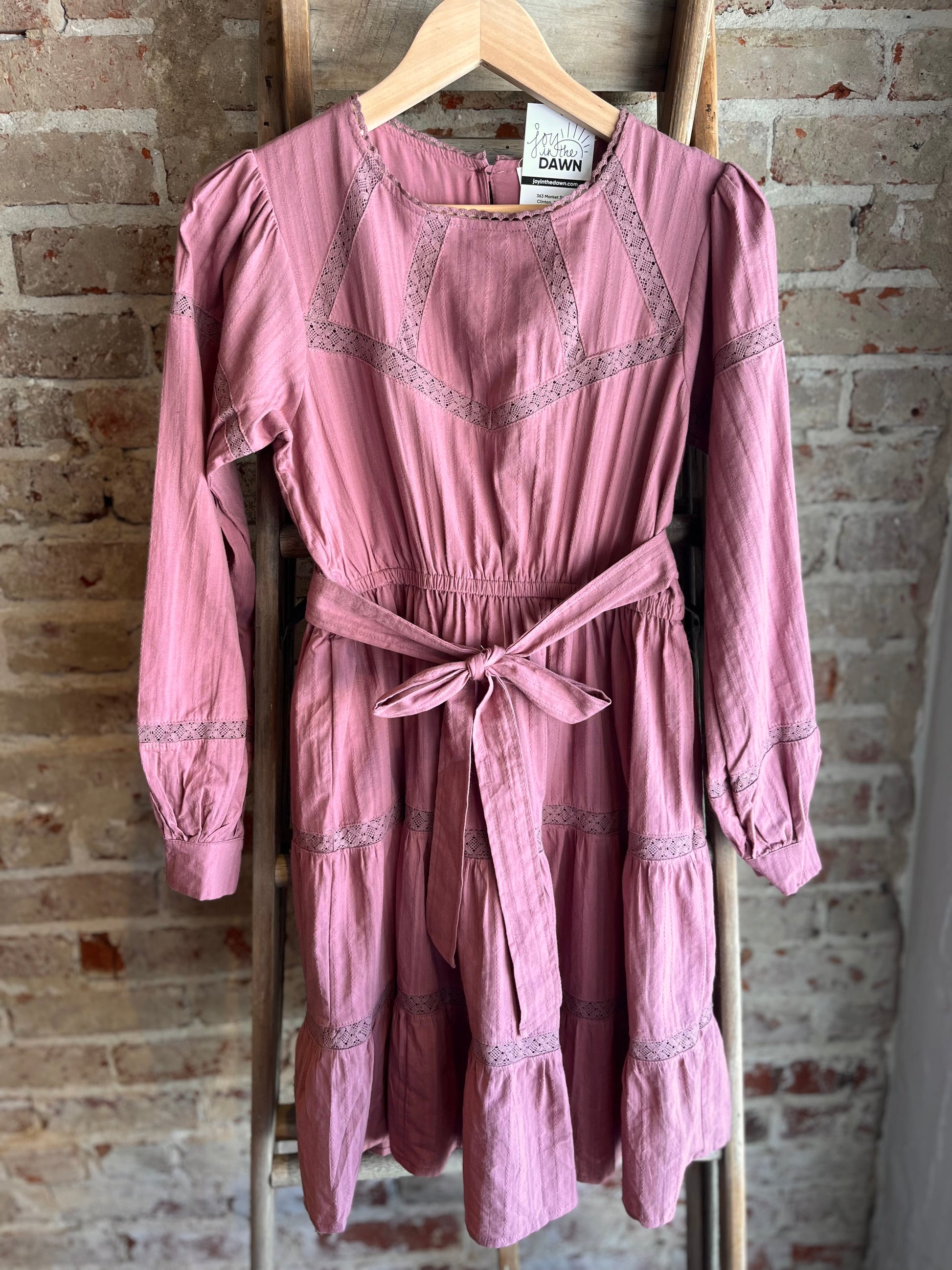 Lace inlay tiered mini dress features self tie belt, elastic waist, lining, lace trim, and back button keyhole.
