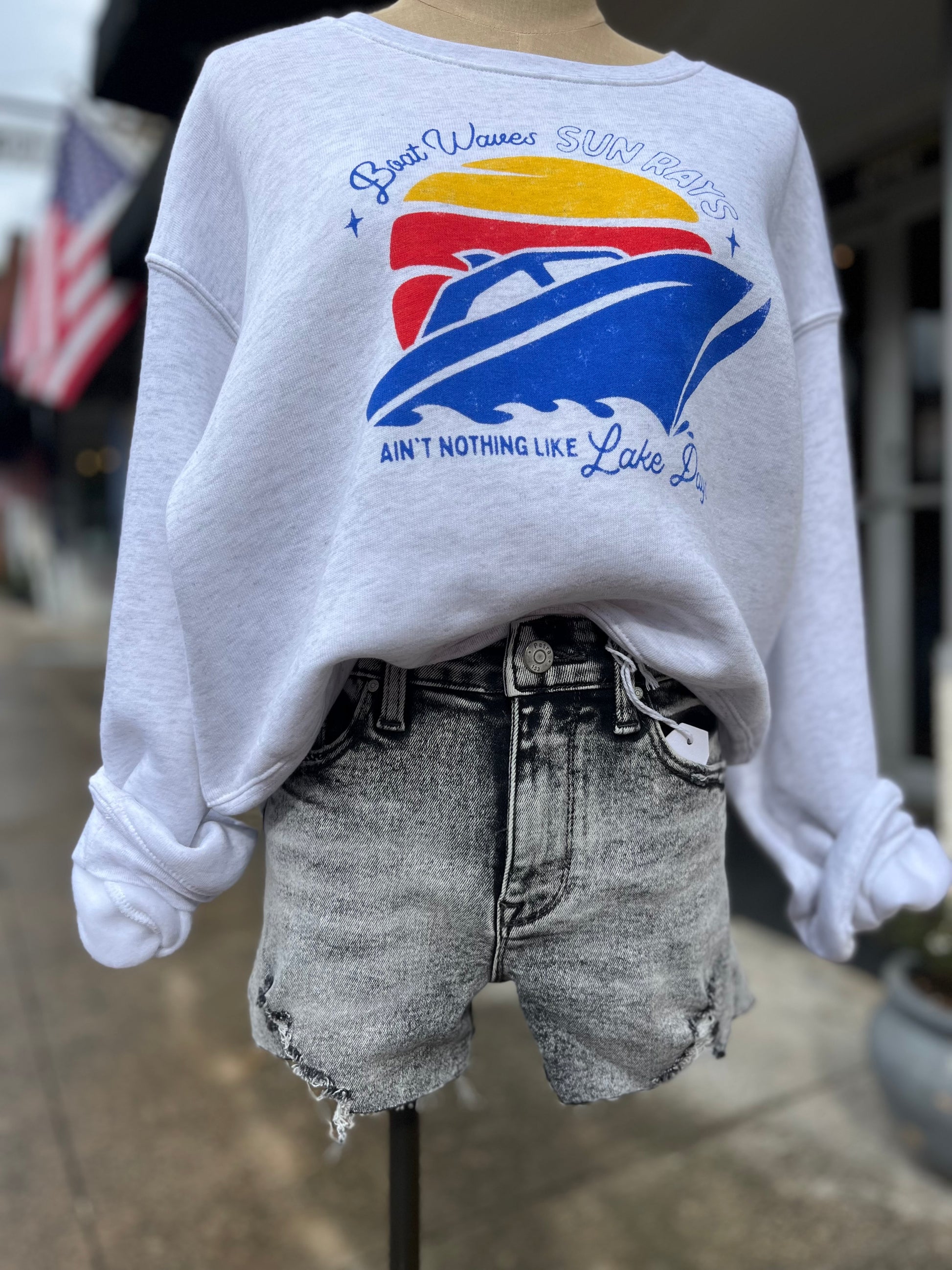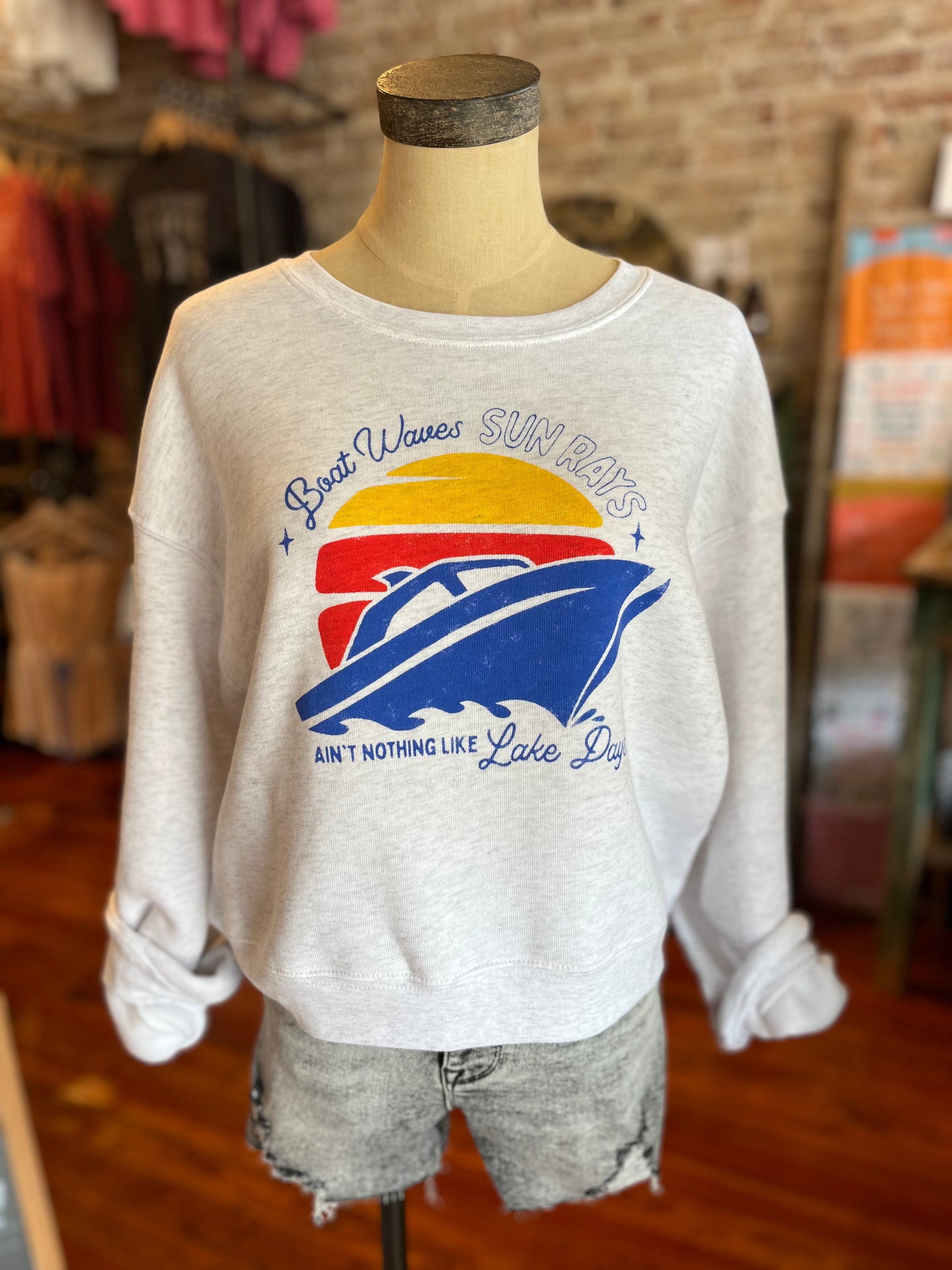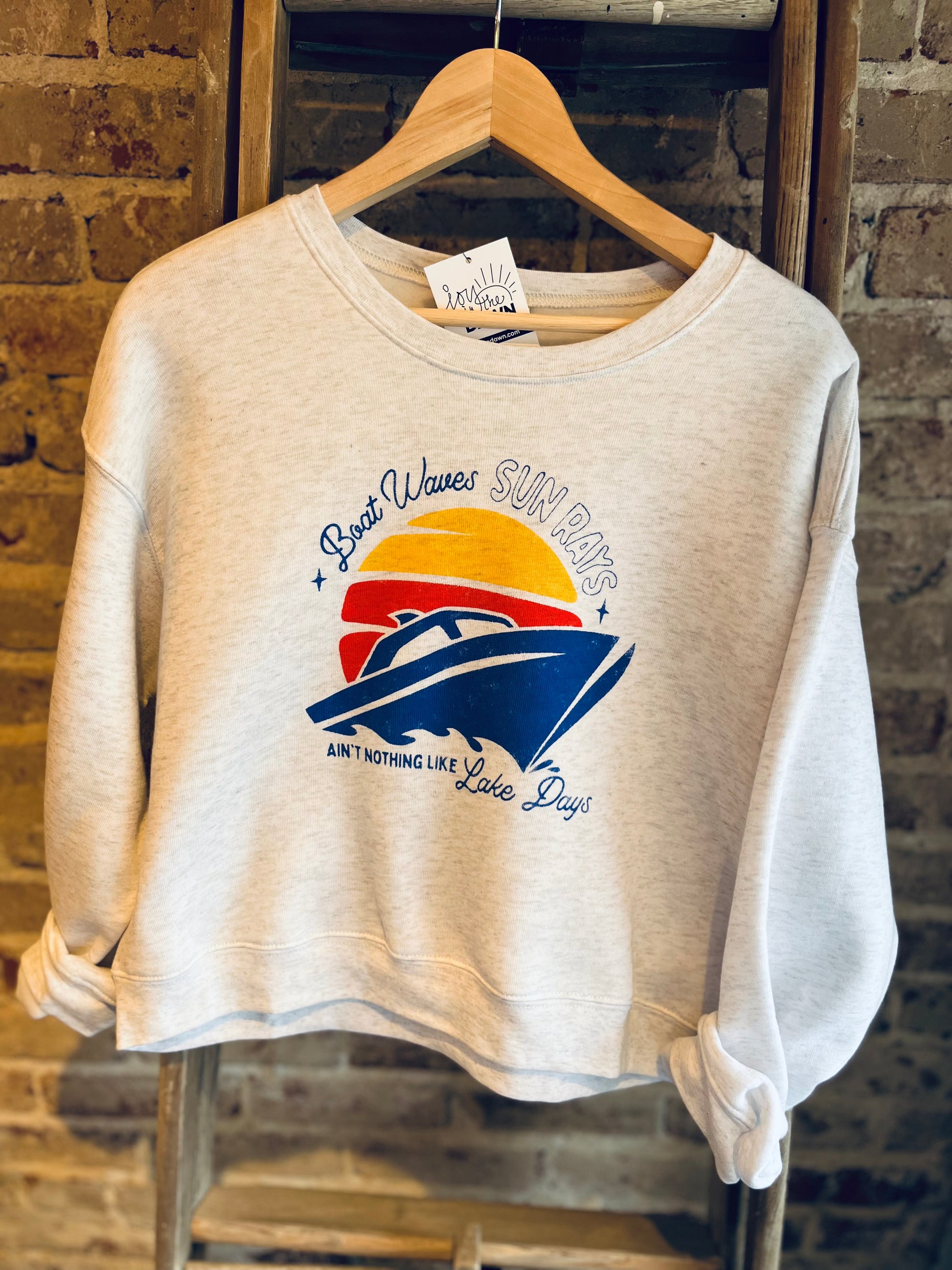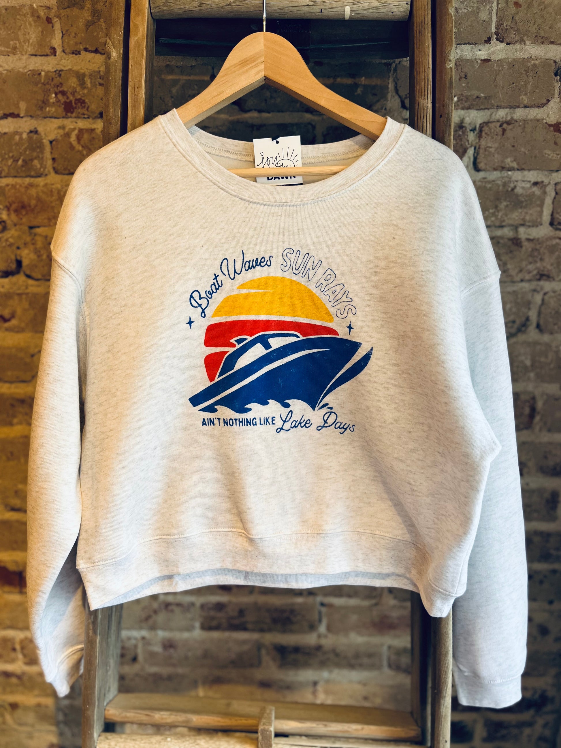 "Boat waves and sun rays; Ain't nothing like lake days!” This SUPER soft crop sweatshirt fits oversized and hits at the waist! It is perfect for nights @ the lake!