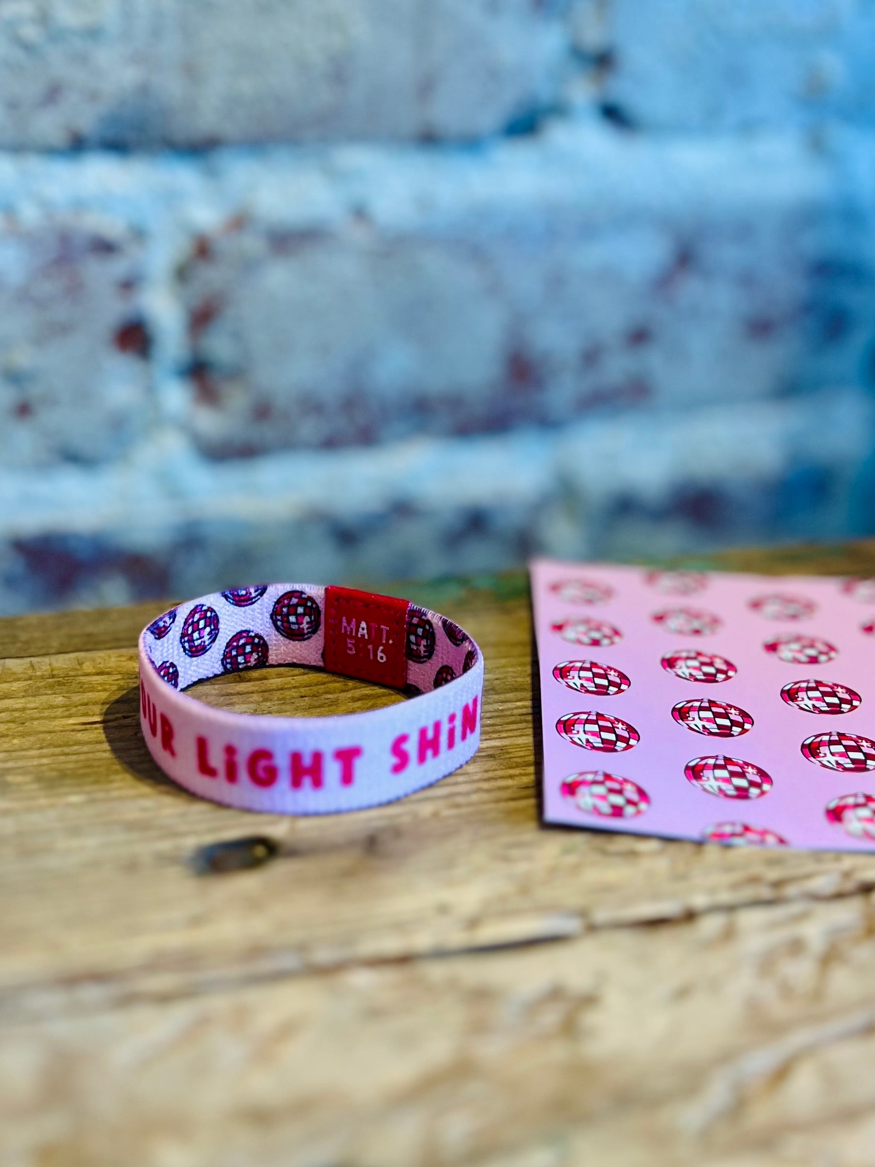 Details: Double-Sided Polyester Elastic Wristband Artwork printed on one side. "Let your light shine" printed on other side. 3" before stretching.