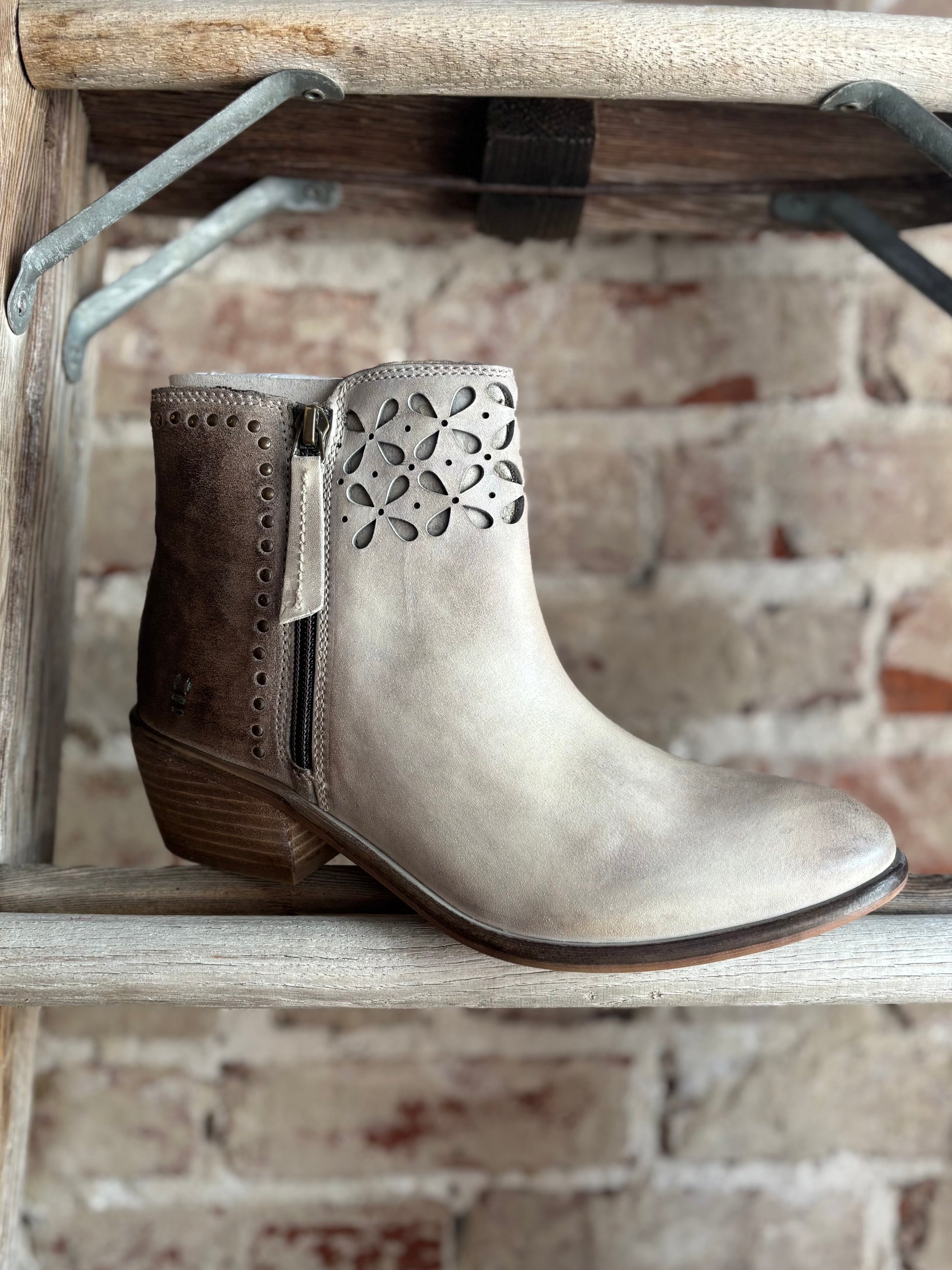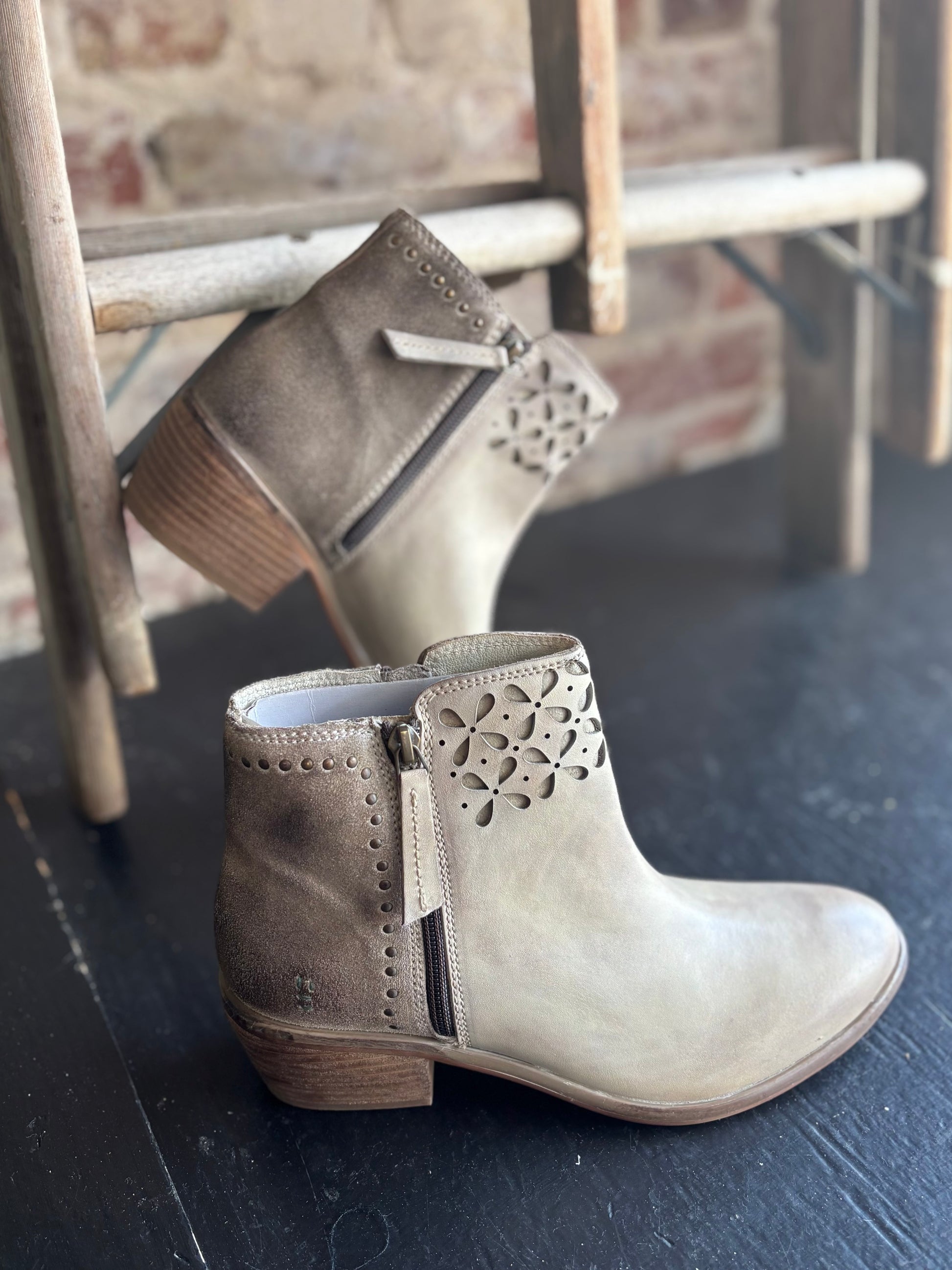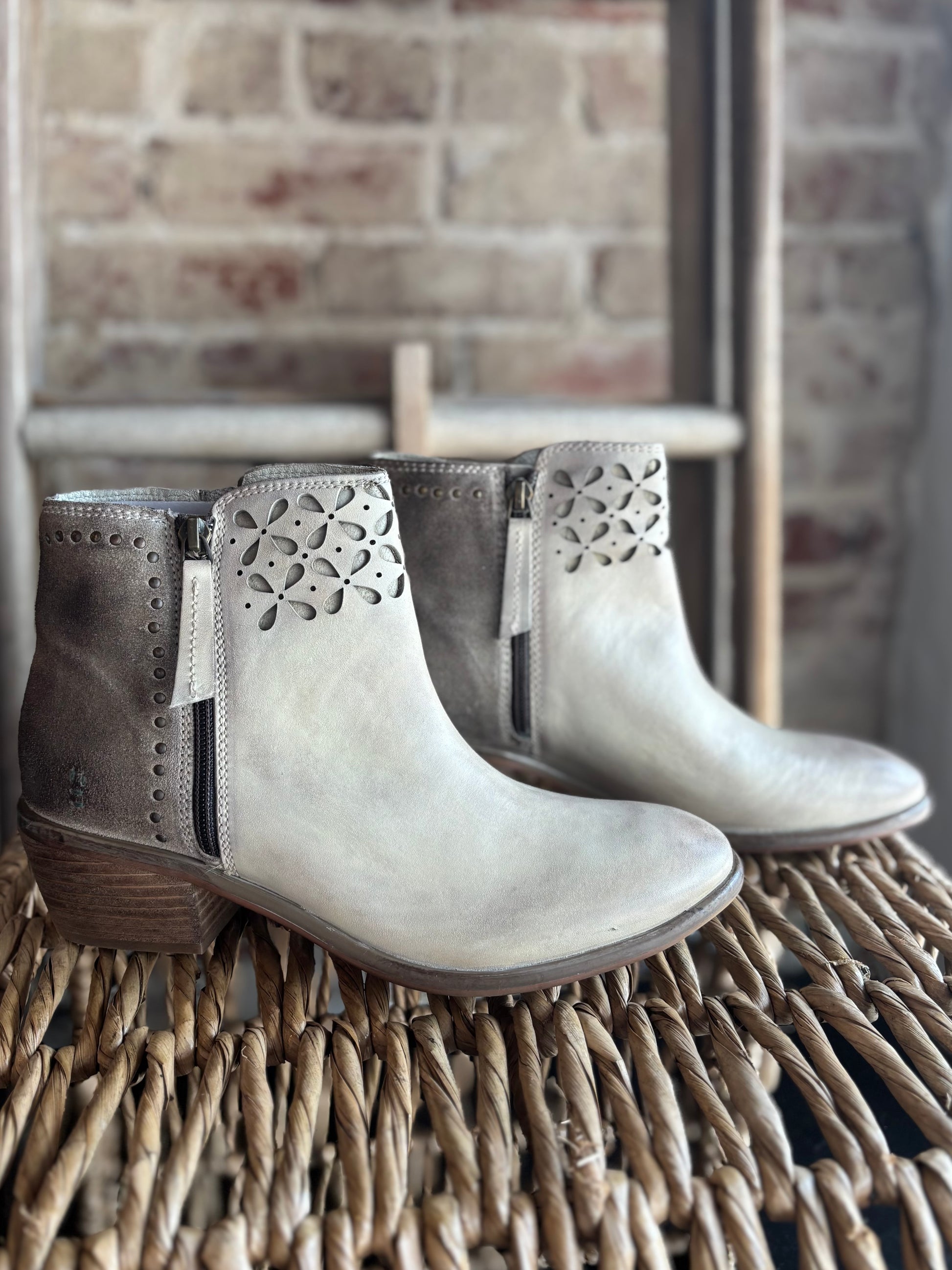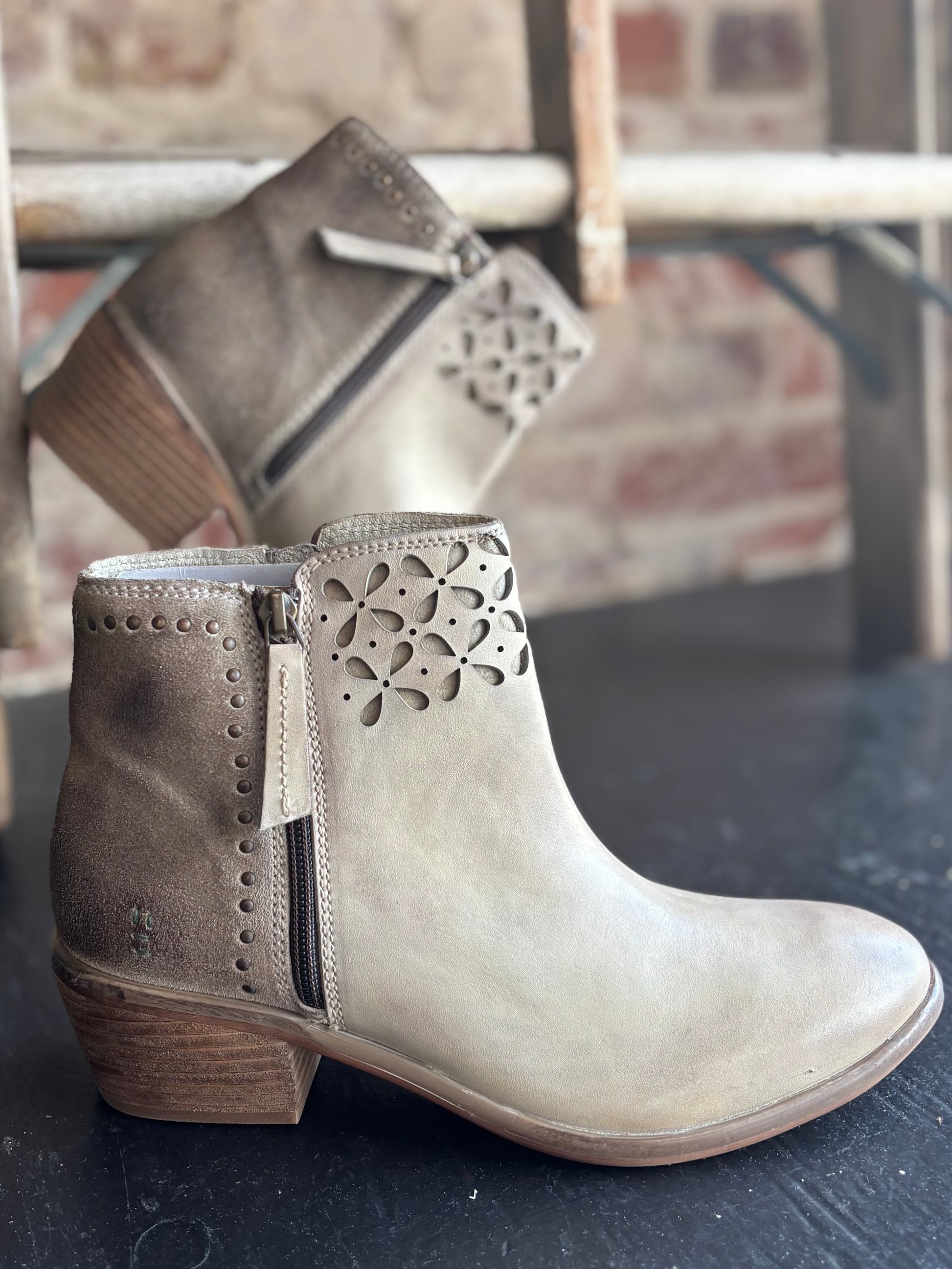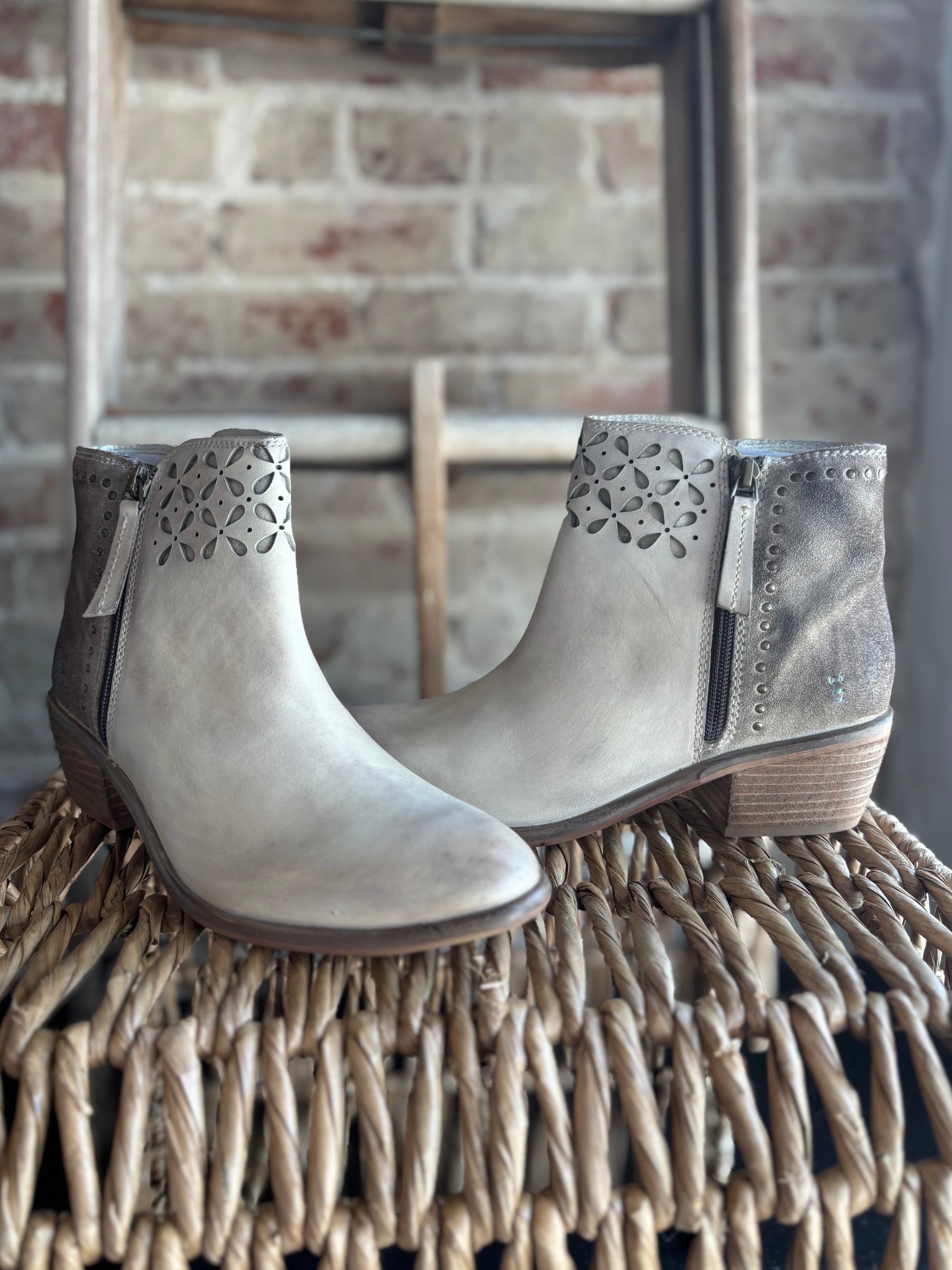 Showcase your uniqueness with these super cute genuine leather booties. These boots are crafted with mixed materials for a distinctive and eye-catching look. The intricate cutout petal design on the upper, combined with gold rivet details on the heels, adds a touch of elegance. These subtle yet striking details enhance the overall aesthetic, making these boots truly exceptional.
