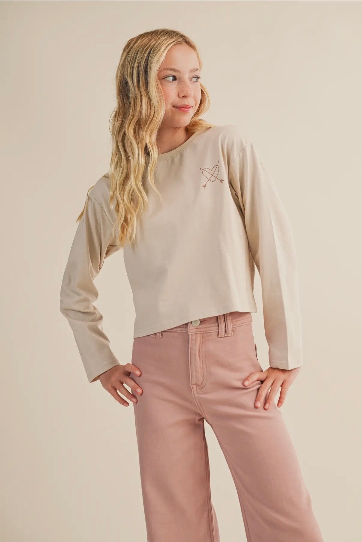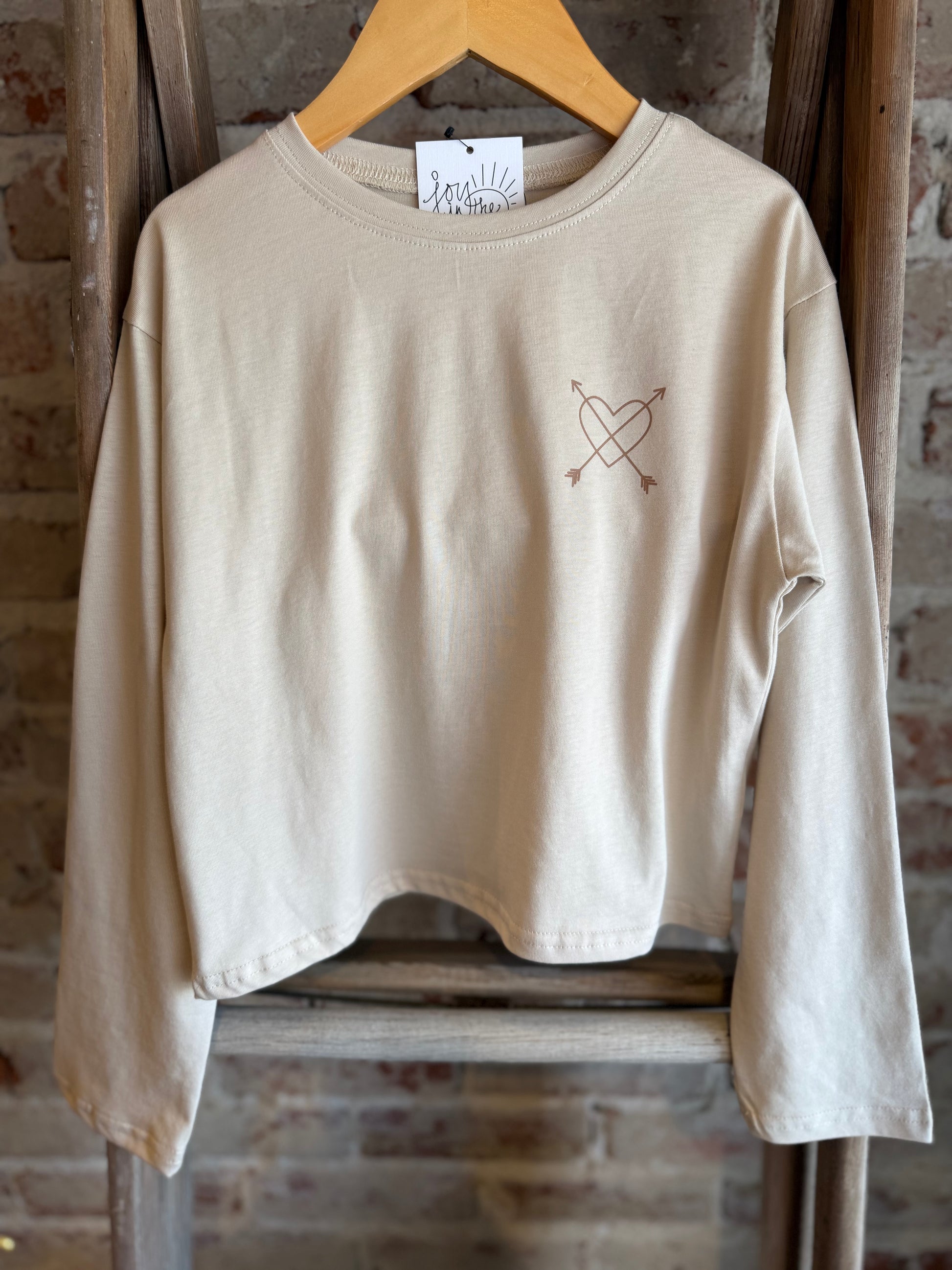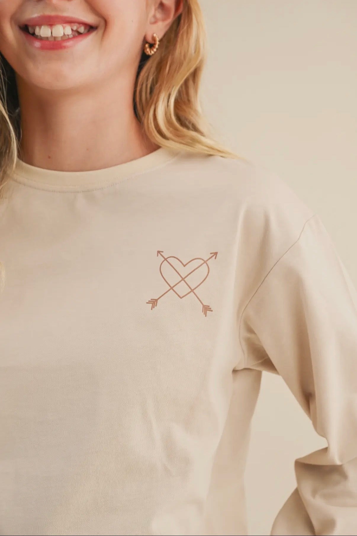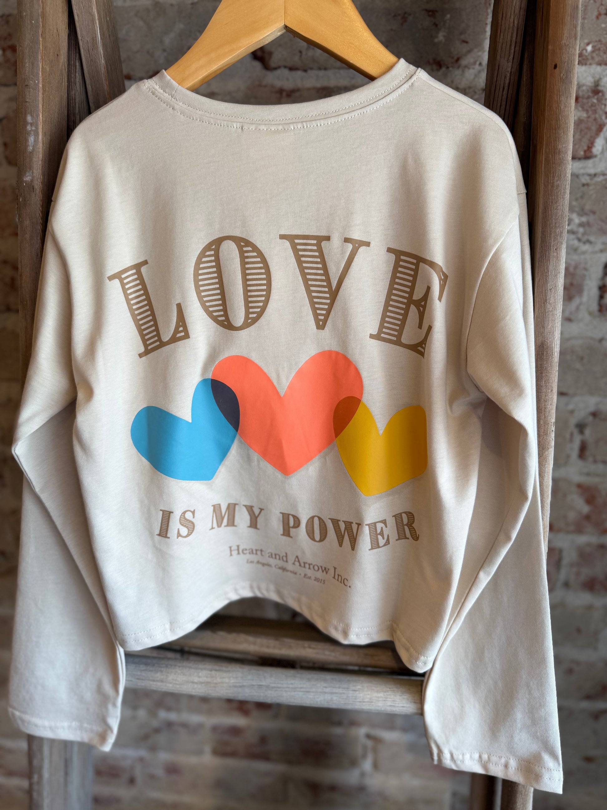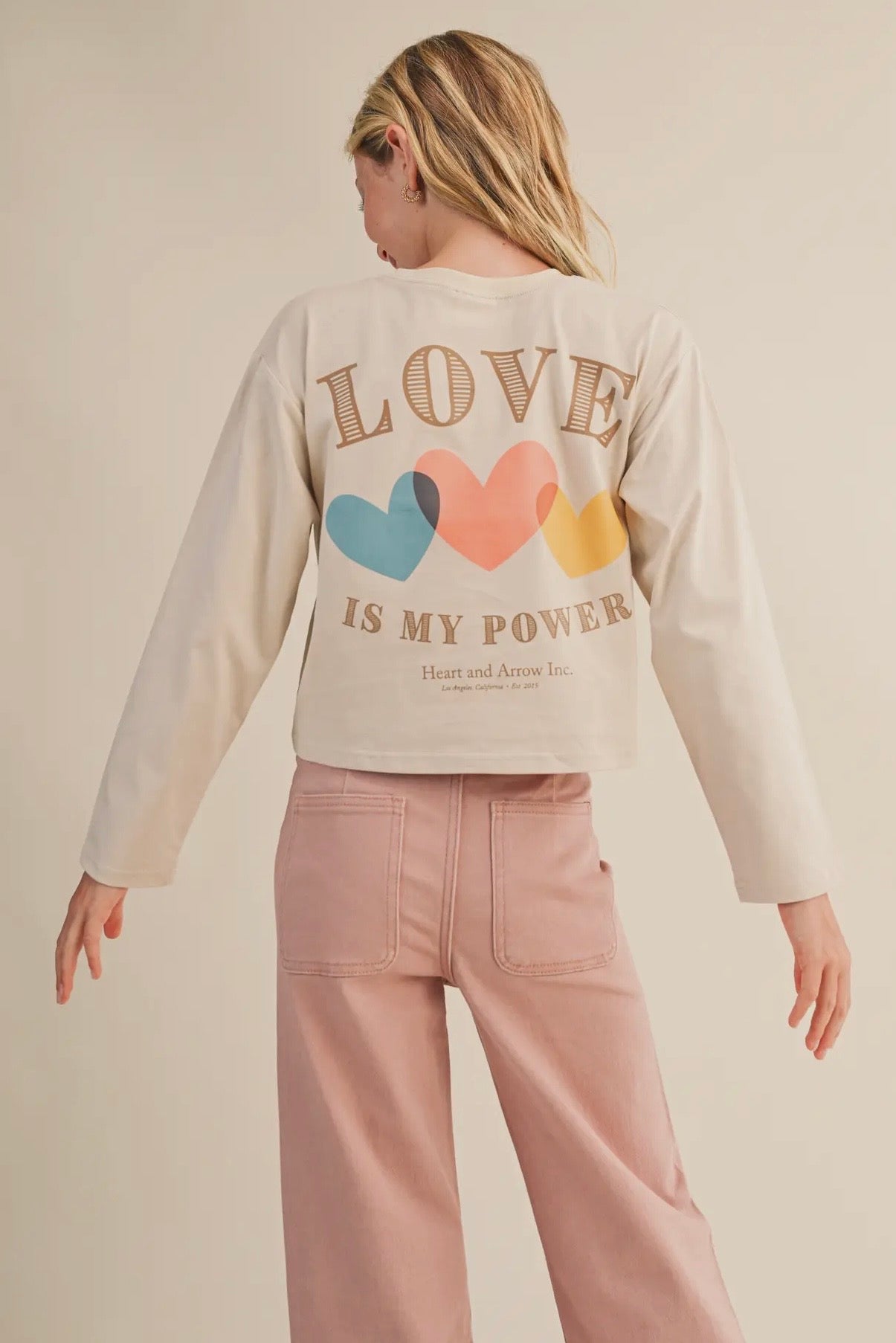 Spread positivity in style with this “Love Is My Power” graphic long-sleeve tee. Crafted from soft, premium cotton, this cream-colored top features a minimal heart-and-arrow logo on the front and a bold, colorful heart graphic on the back with the empowering phrase “Love Is My Power.” The playful typography and pastel color palette make it a feel-good essential that pairs perfectly with jeans, shorts, or skirts.