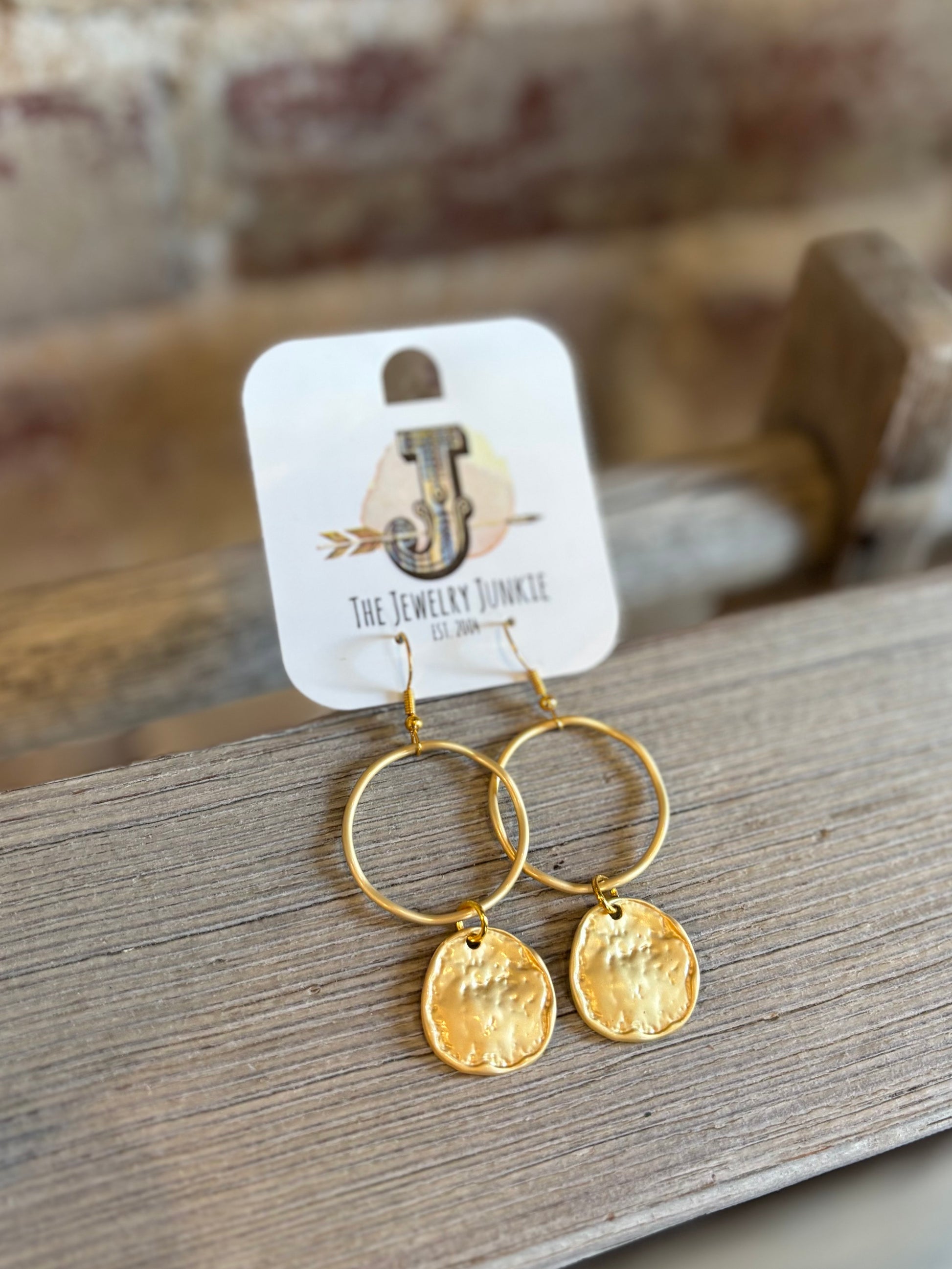 Elevate your style with these Matte Gold Hoop Earrings featuring a delicate Coin Dangle. Handmade with a touch of elegance, these earrings add a unique statement to any outfit. Make a bold and confident fashion statement with this must-have accessory.