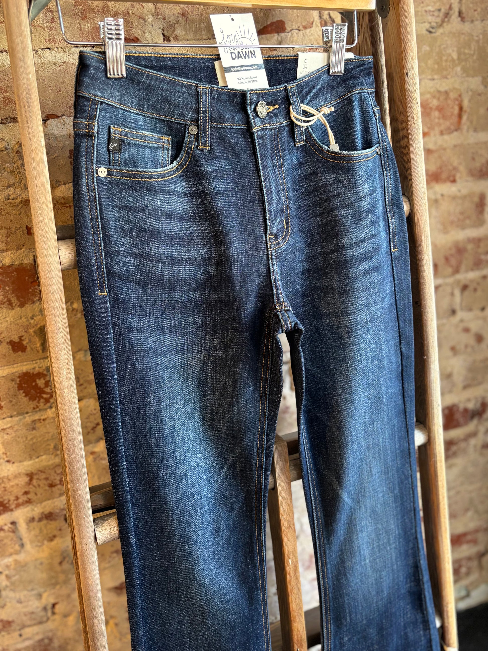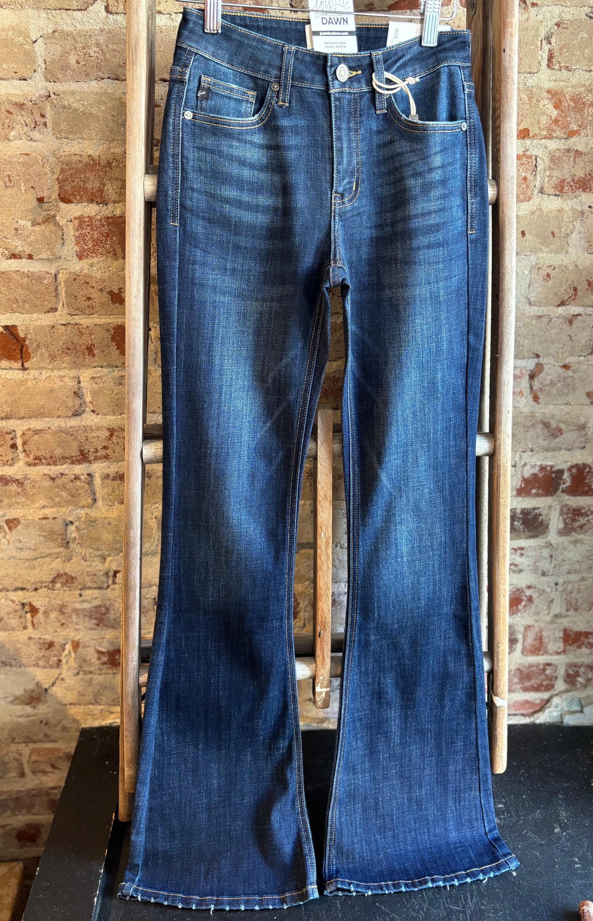We love these mid rise flare jeans in a dark wash! Flattering with a slight stretch.