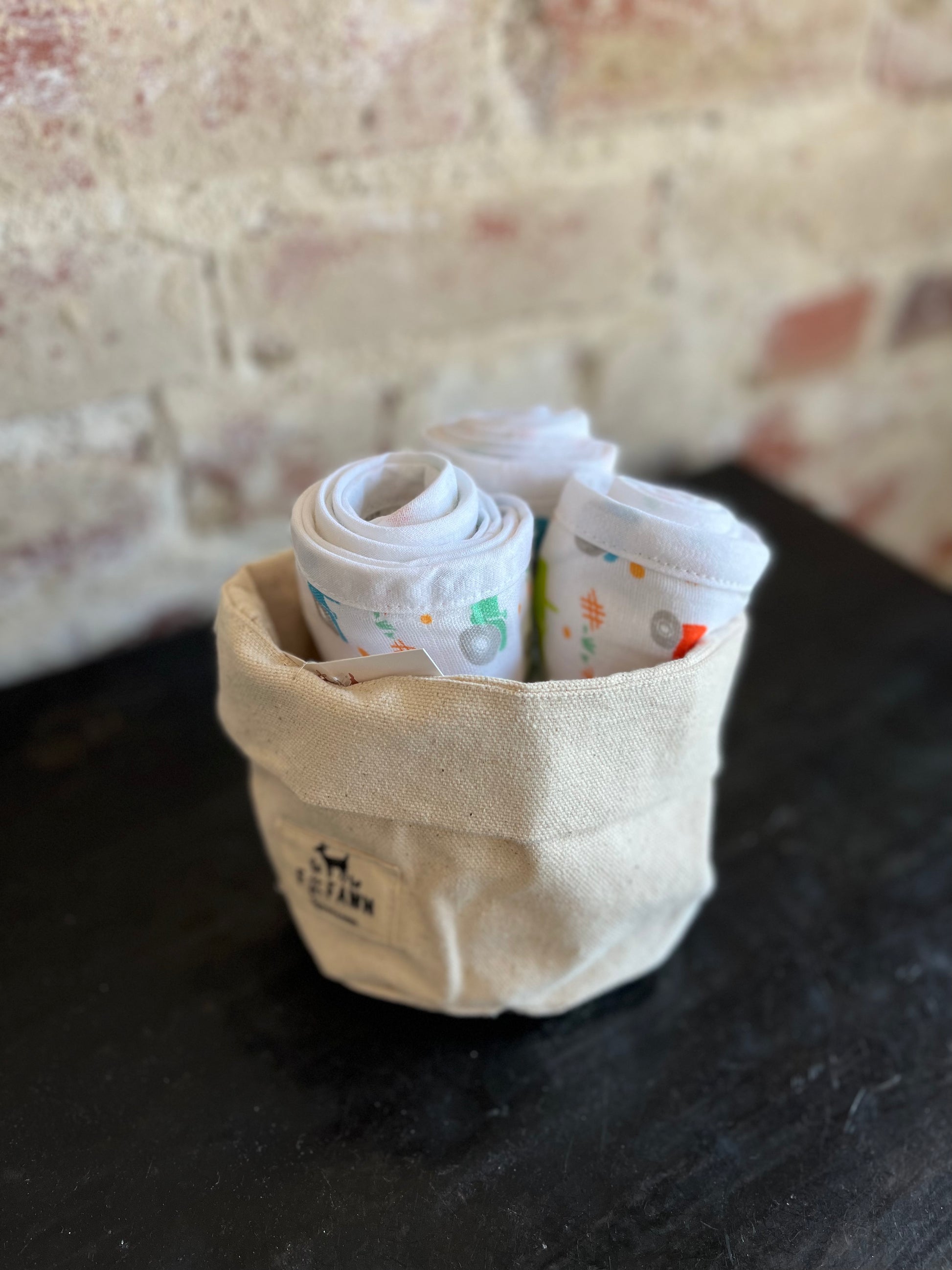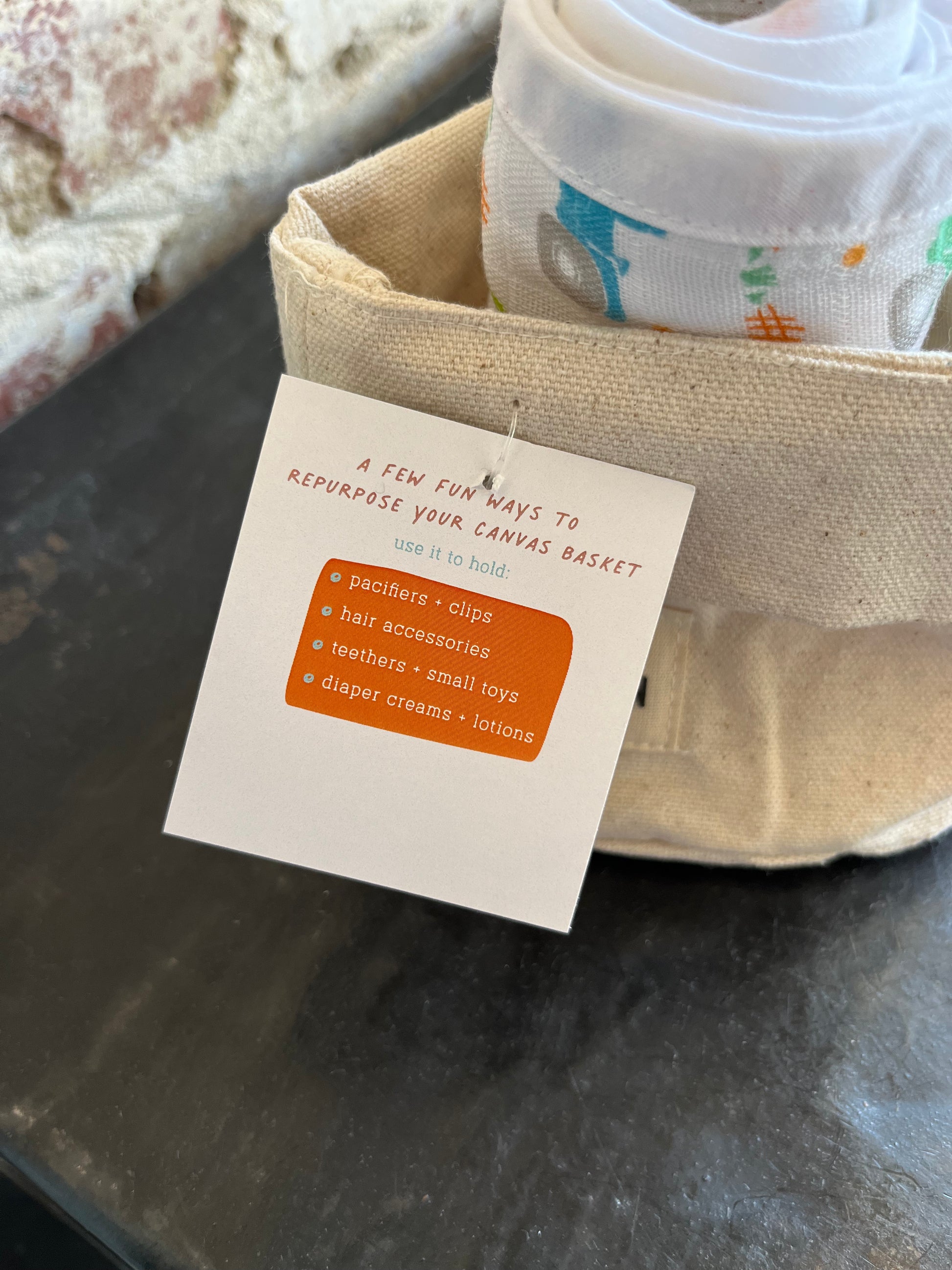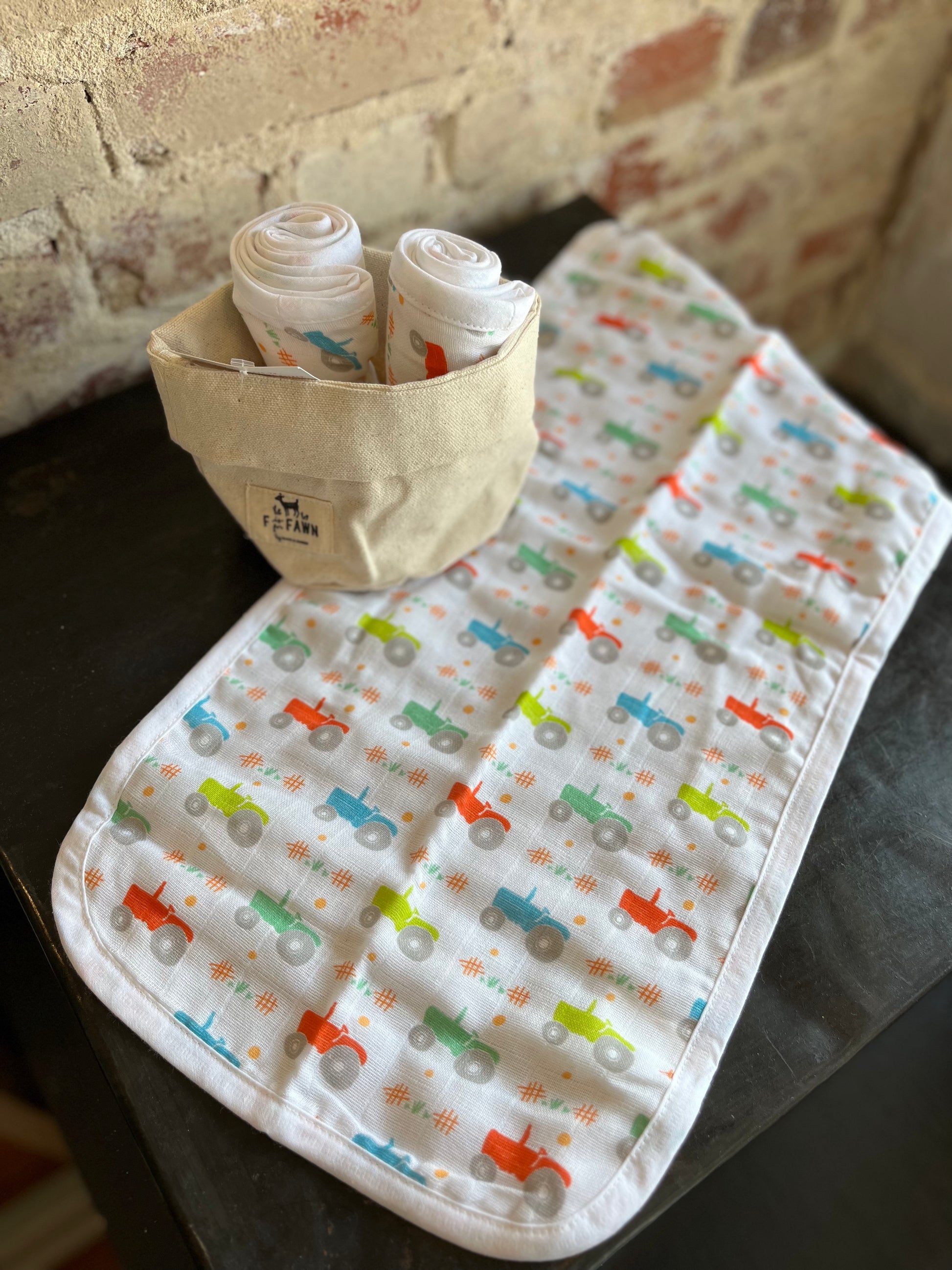 Something about this muslin fabric just says baby. Covered with cute little tractors for your future farm-hand. You will receive 3 muslin tractor burp cloths plus the reusable canvas basket. This would make a perfect baby gift!