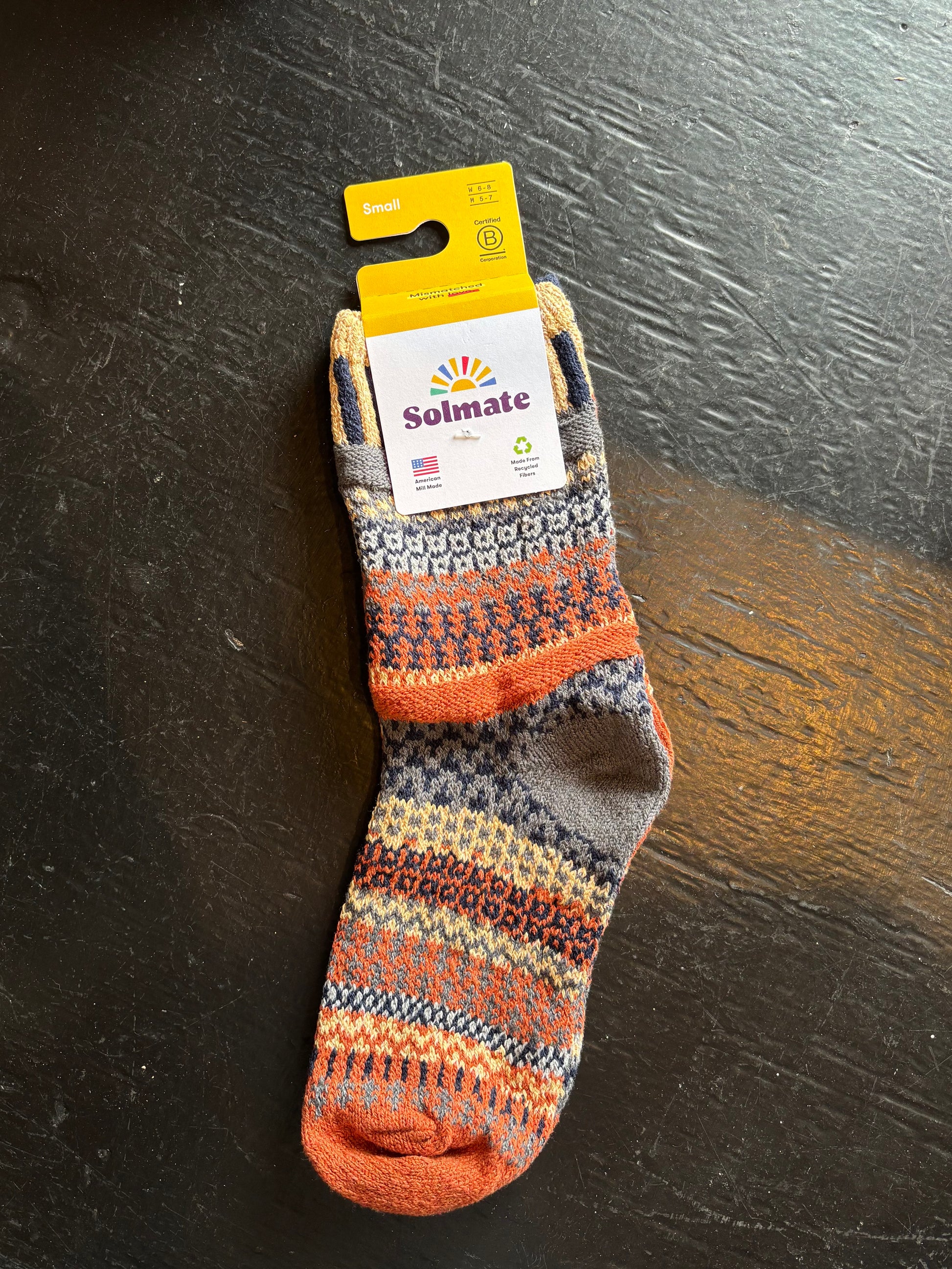 Colors in this sock: navy, pale yellow, gray-blue, burnt orange.