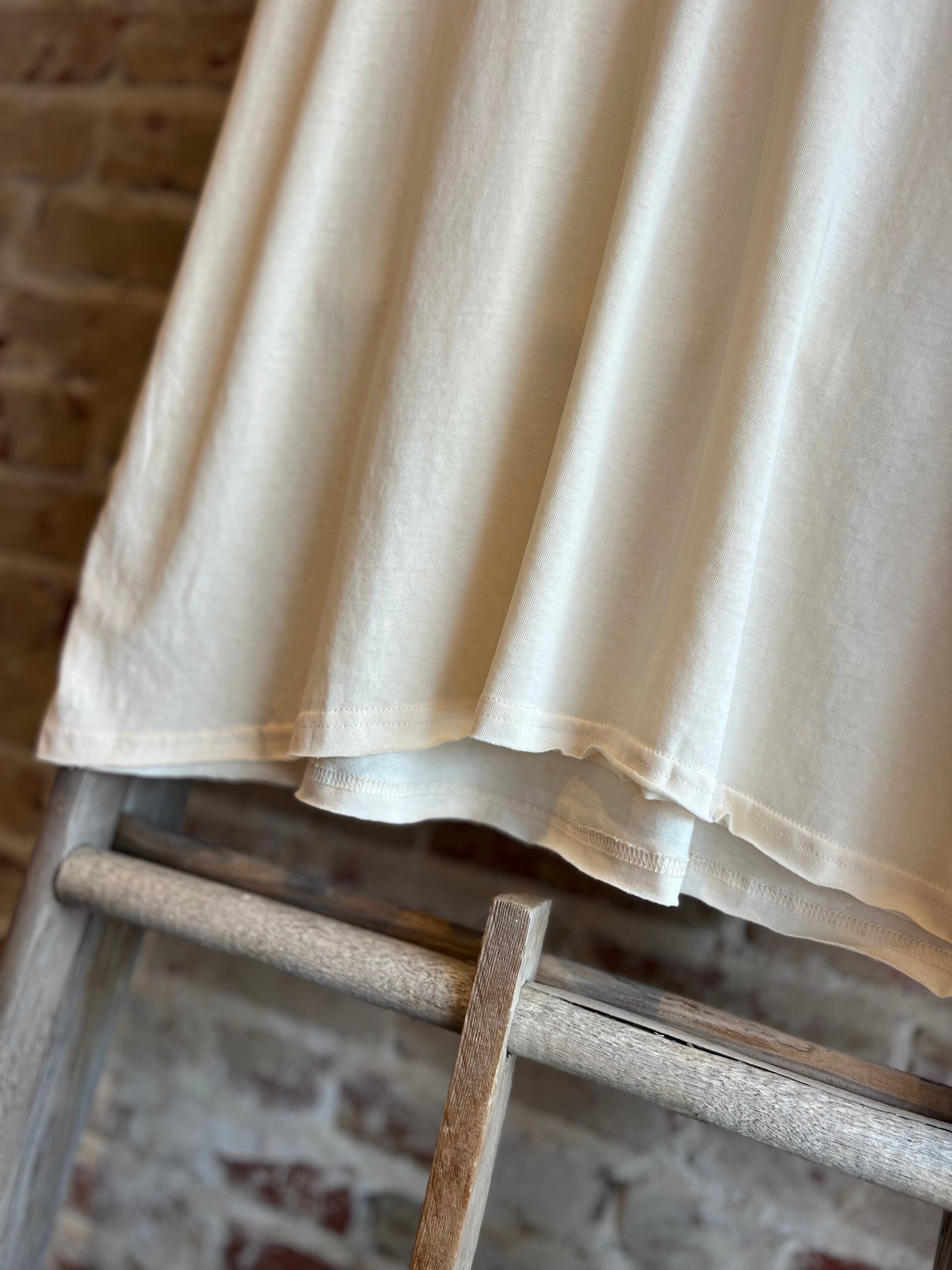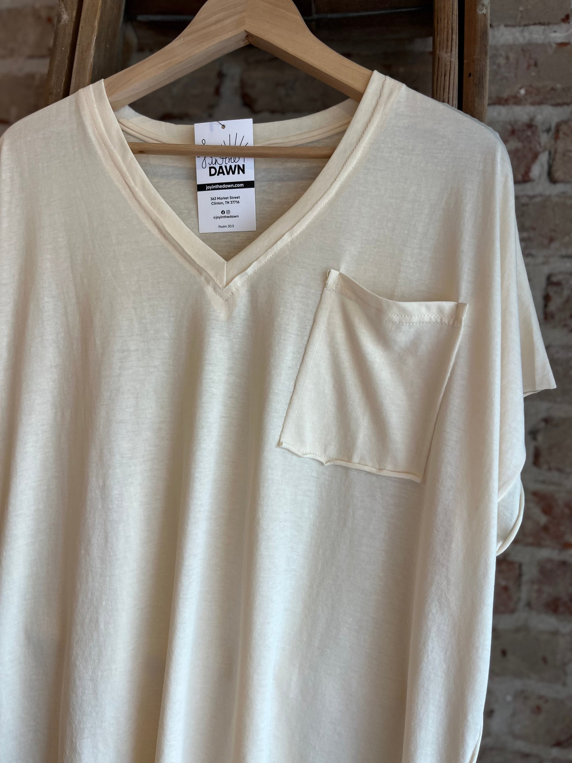 A great closet staple pocket vneck tee that can be dressed up or down. This cream tee can be worn year around! It fits oversized. Pair with it with all the things, skirts, denim, overalls, etc!