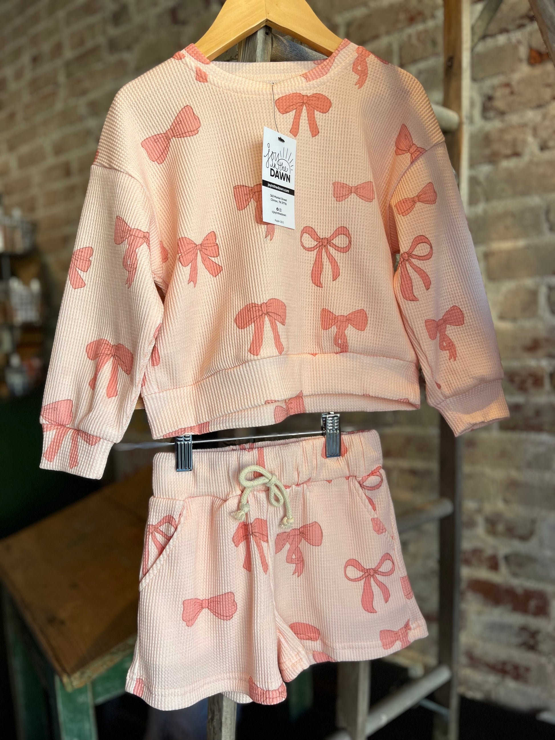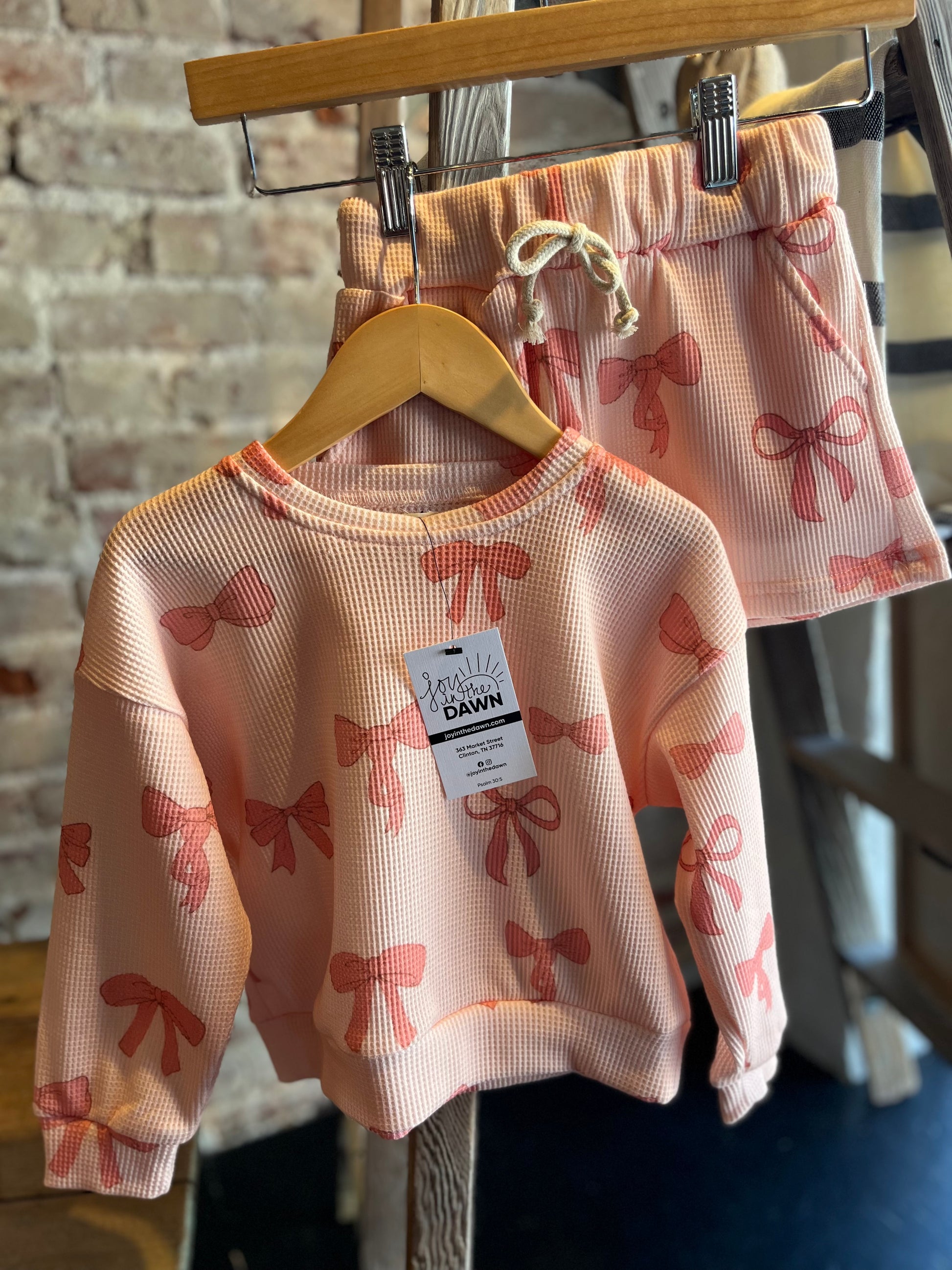 THE cutest set for your girls! Oversized drop shoulder waffle knit with ribbed neck, wrist cuffs & hem lounge set! Lightweight and sure to be a new fav!