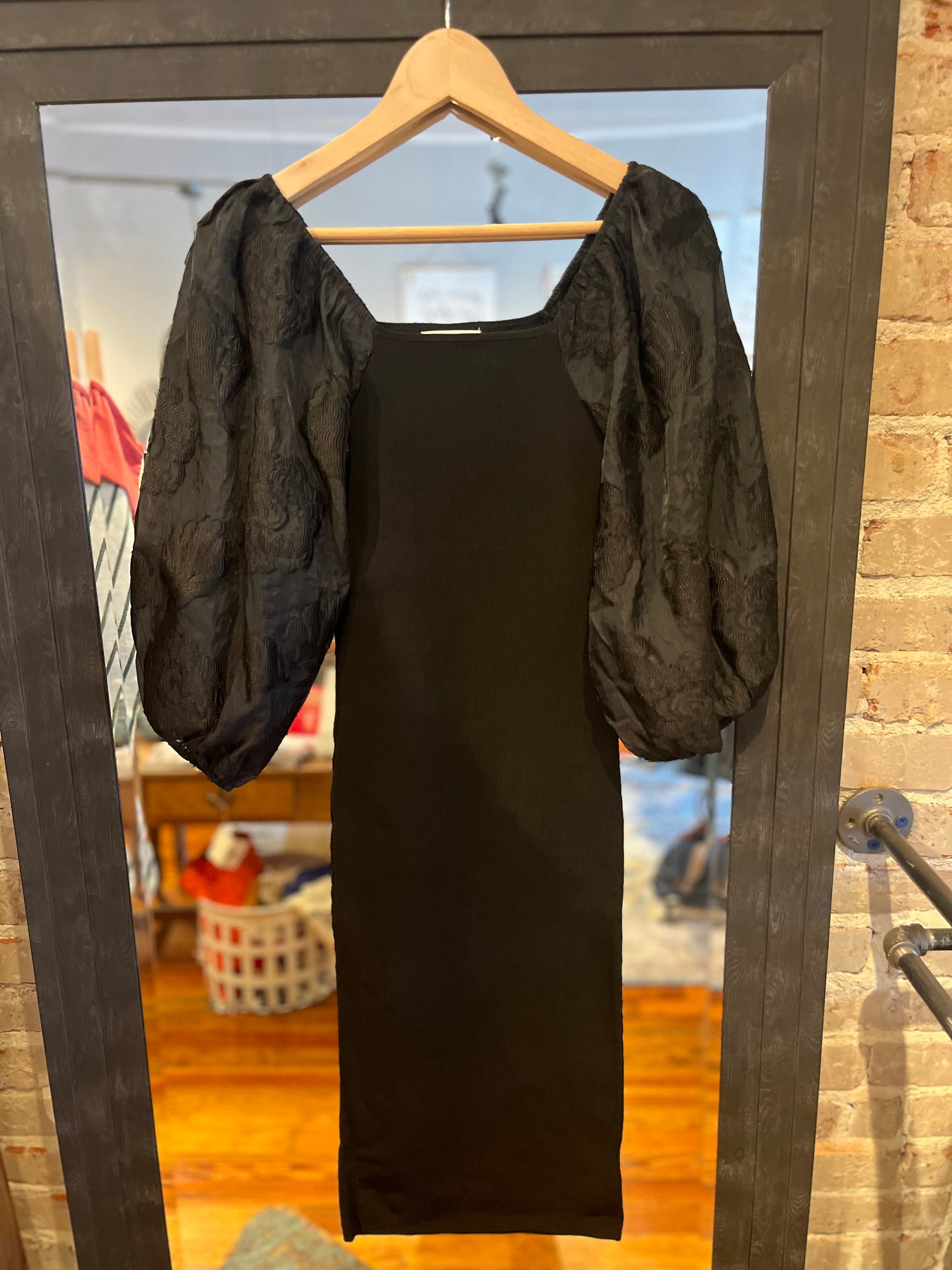 Love this puff sleeve black elegant dress which has a classy yet sassy look! It’s a very stretchy fabric that is flattering! A Perfect dress for dates, parties or weddings. The sleeves are embroidered with a floral design in black thread for a subtle yet beautiful look. Just pair with statement earrings and your favorite shoes!