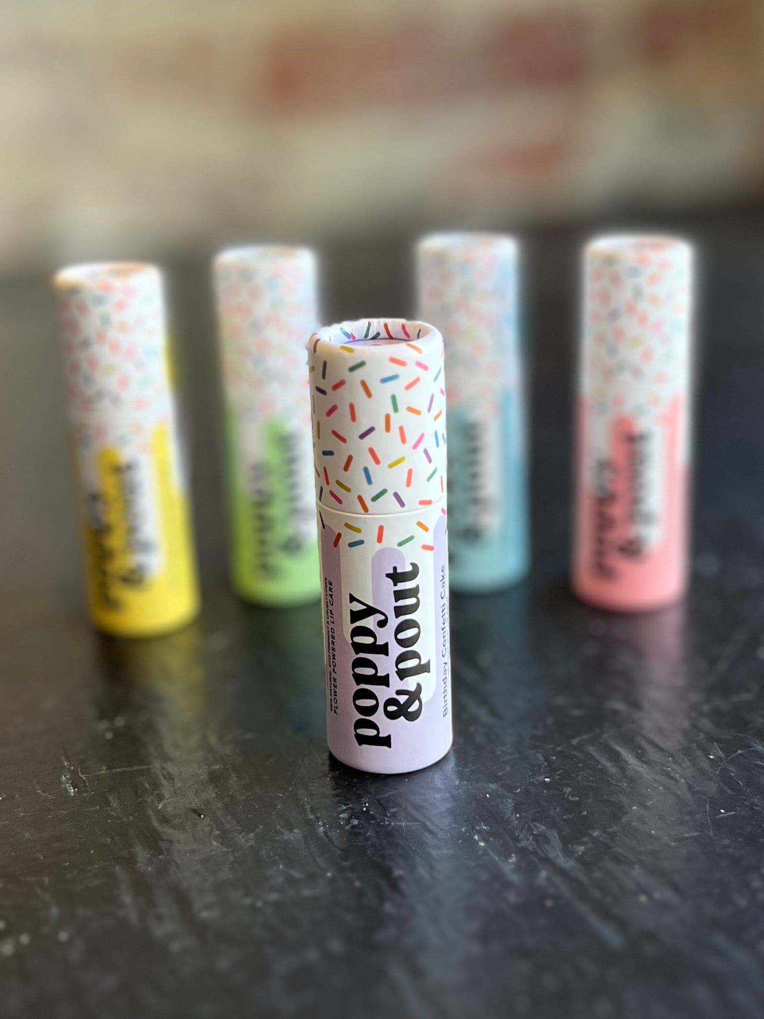 Every Poppy & Pout lip balm is made with 100% natural ingredients and hand-poured into eco-friendly cardboard tubes!