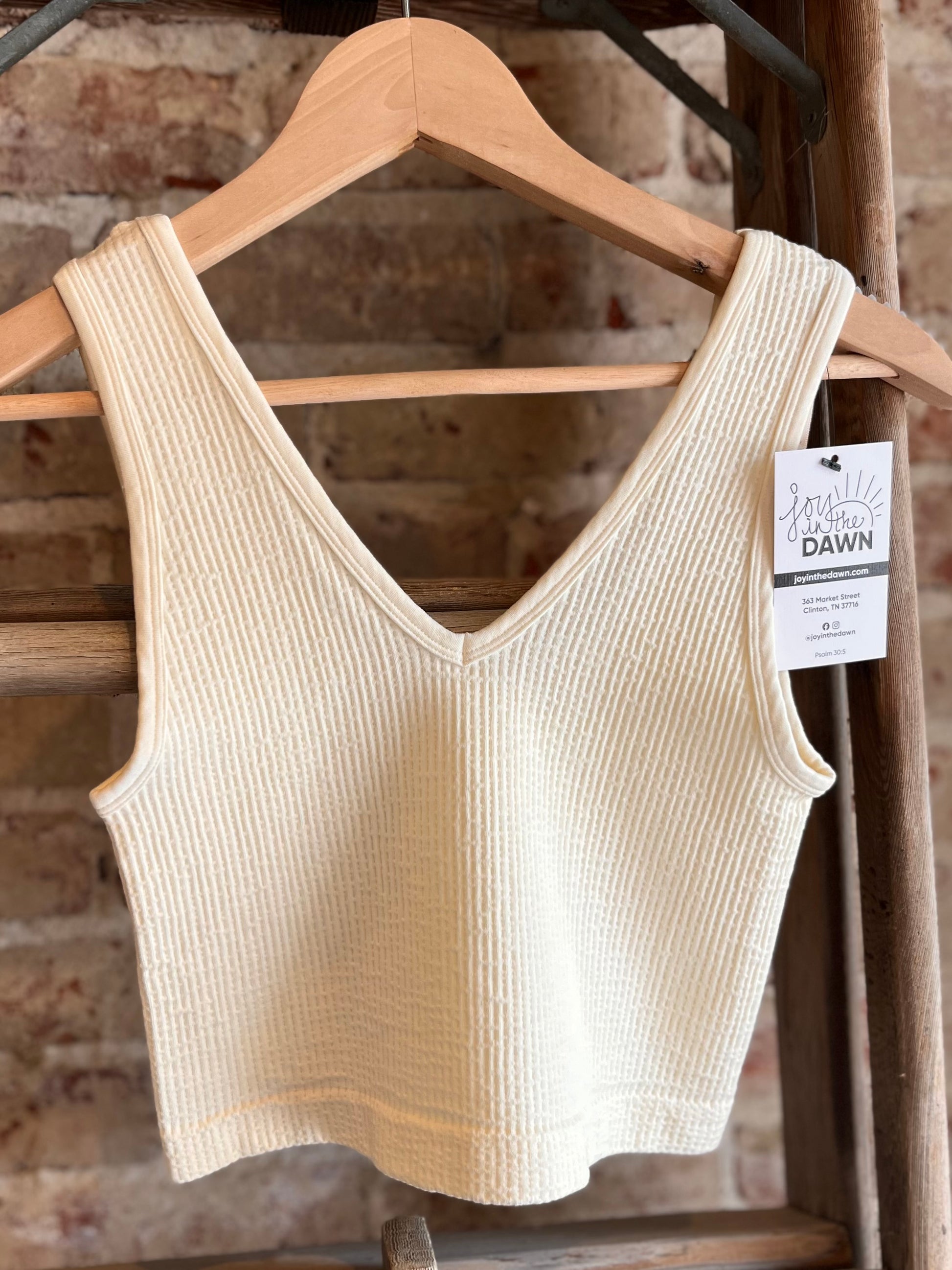 This top is perfect for everyday wear. The reverse U-V neckline, sleeveless design, and cropped length create a simple and versatile silhouette. This top can be dressed up or down, making it a versatile piece for any wardrobe.