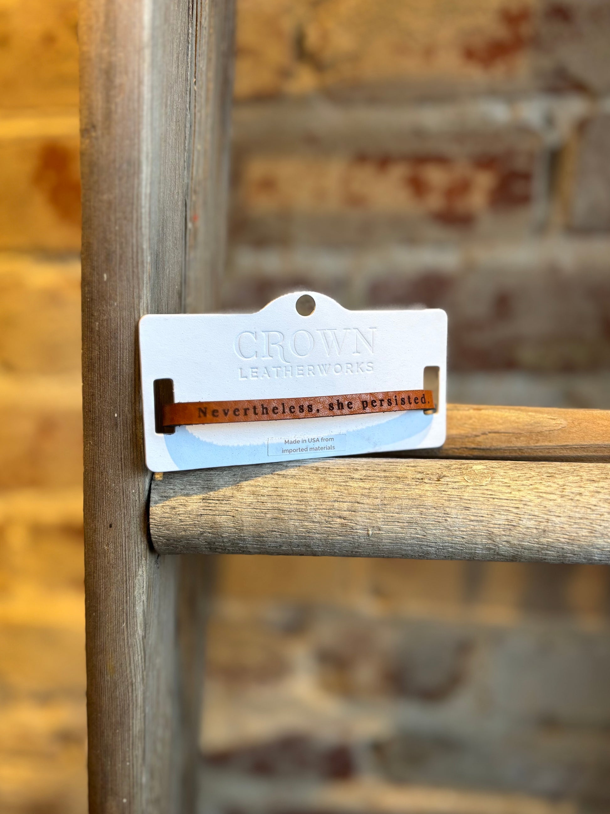 Nevertheless, She Persisted! This beautiful leather bracelet fastens with an antique brass button stud.