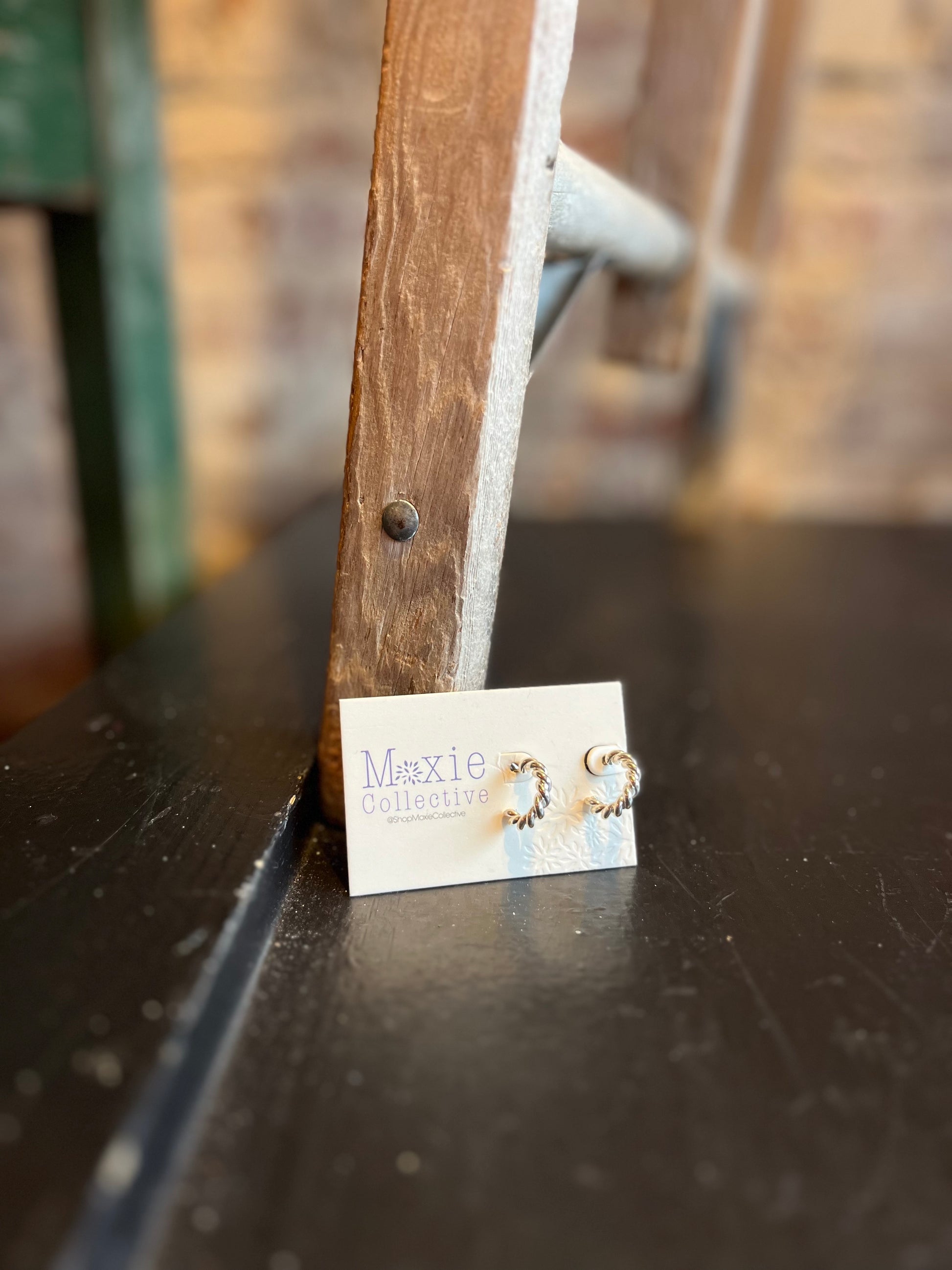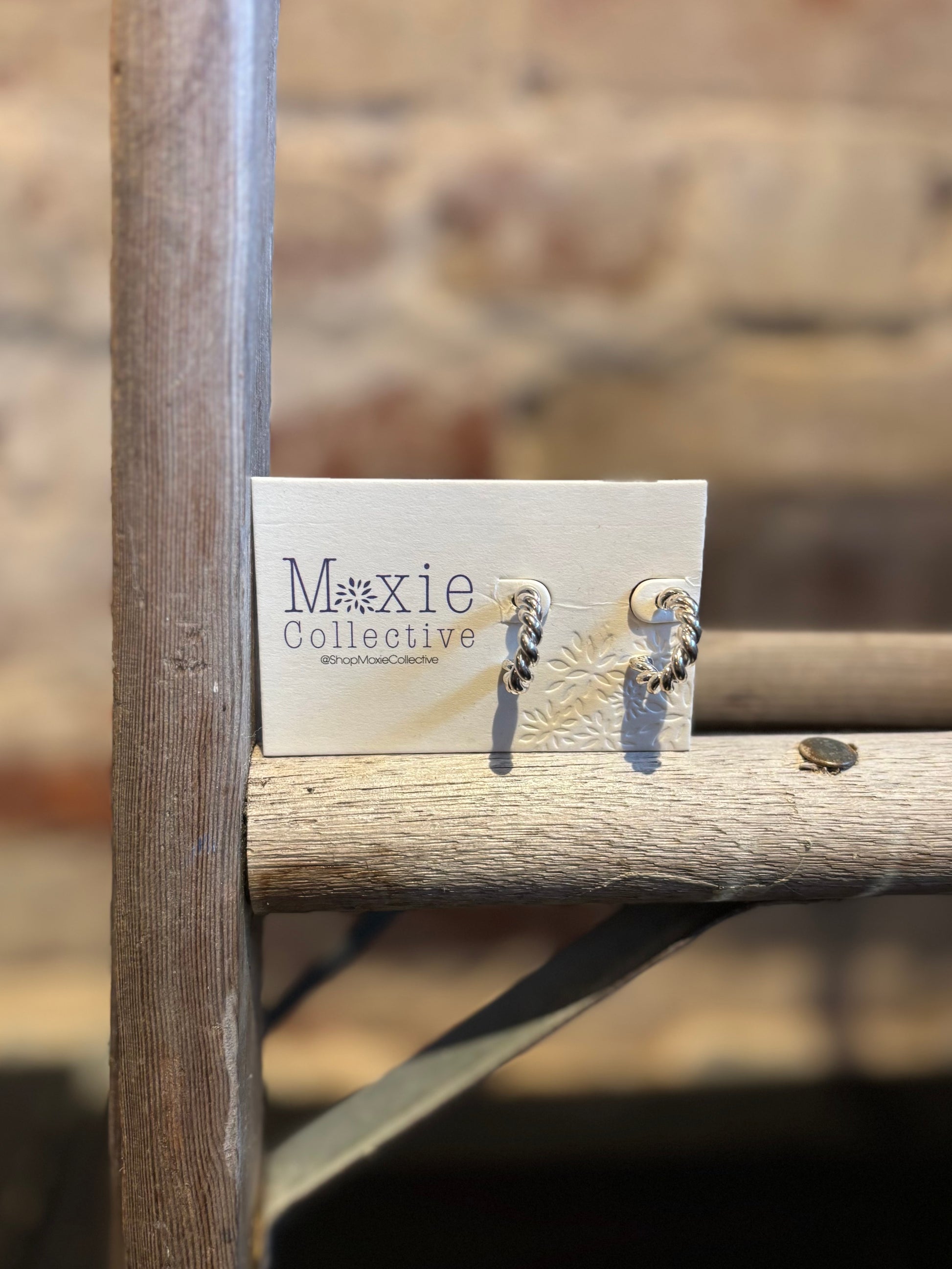 These classic C-shaped hoops feature silver plated brass with a spiraled rope look. These hoops are for running errands, zoom meetings or a classic subdued look when going out!