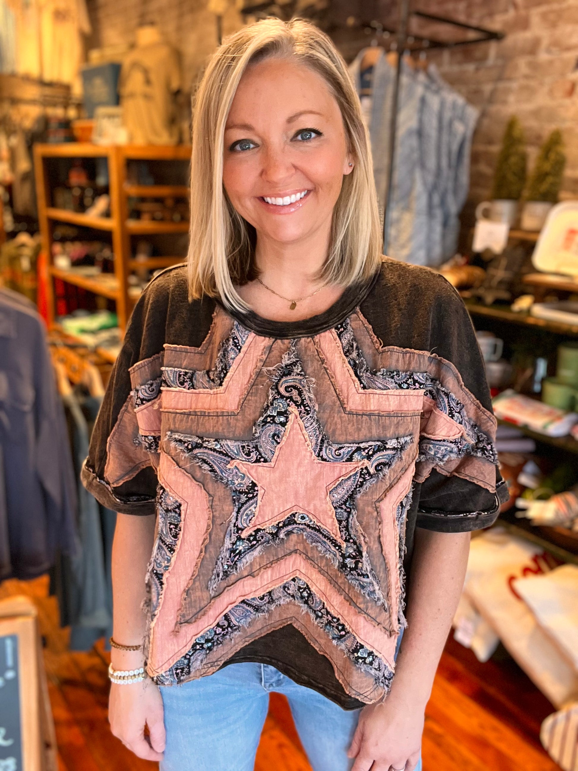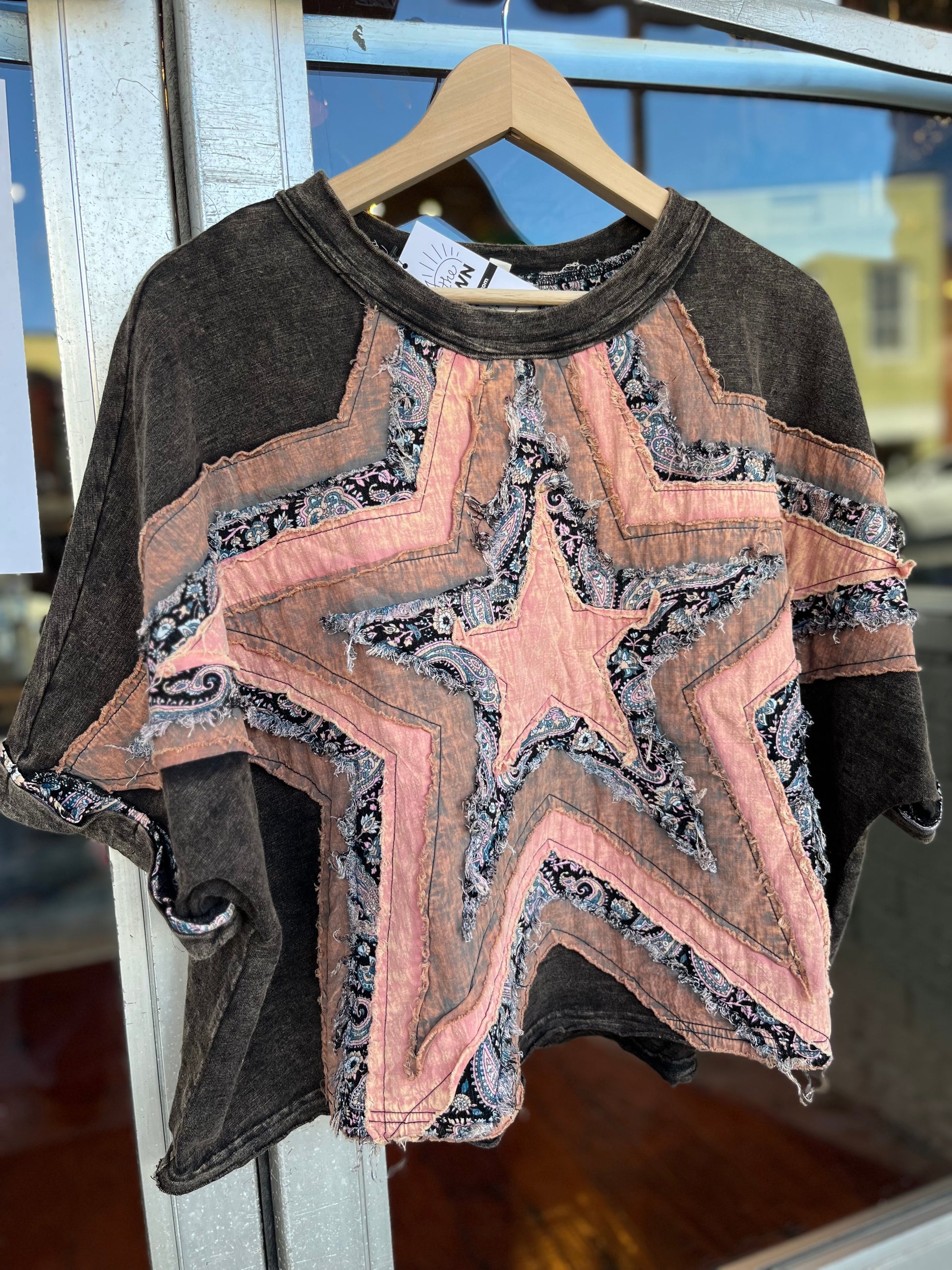 One of our best-sellers in a fresh color! Super cute & very unique! Make a statement with this star patched short sleeve top! Waist length and oversized in a black mineral washed soft fabric.