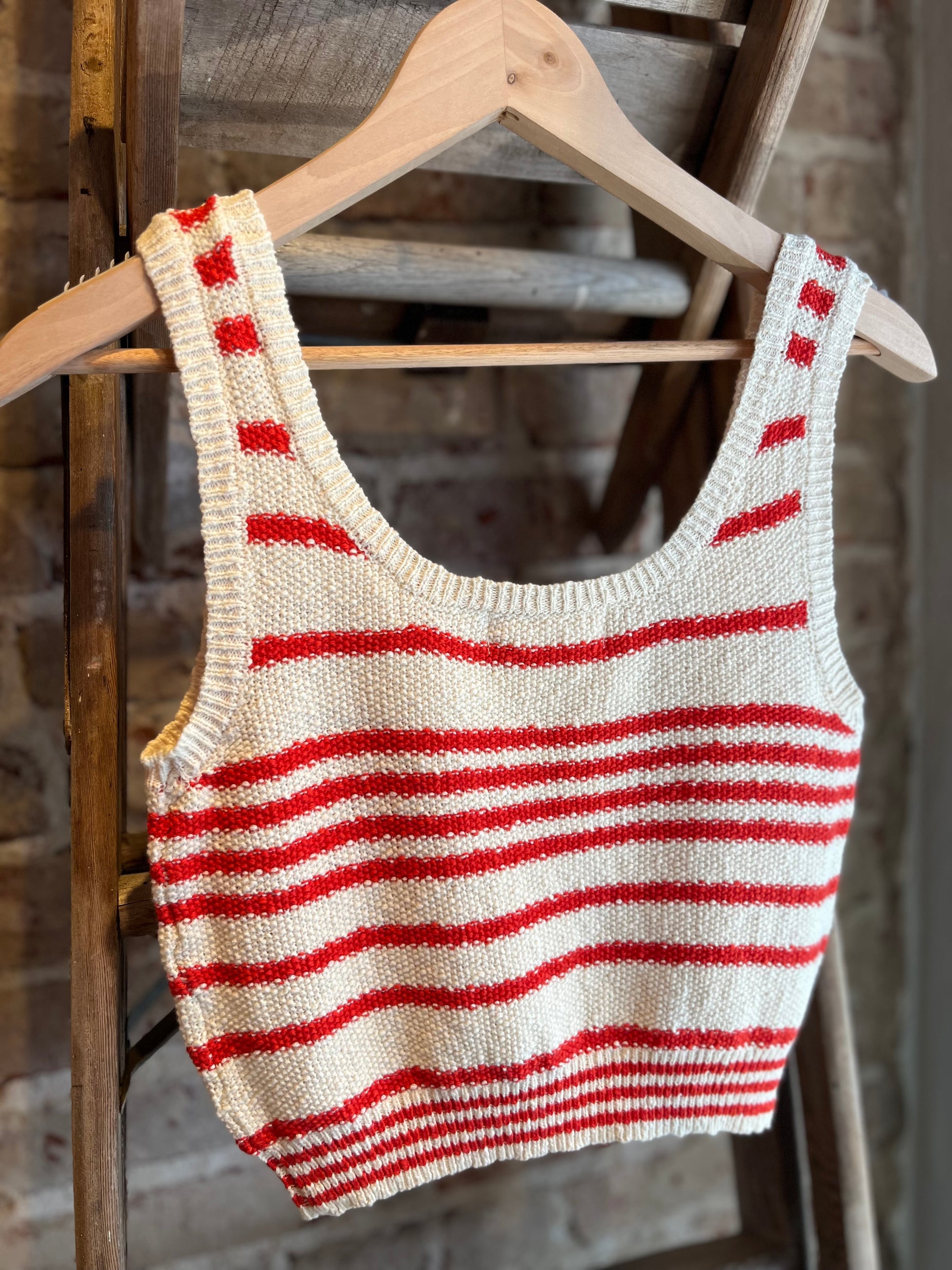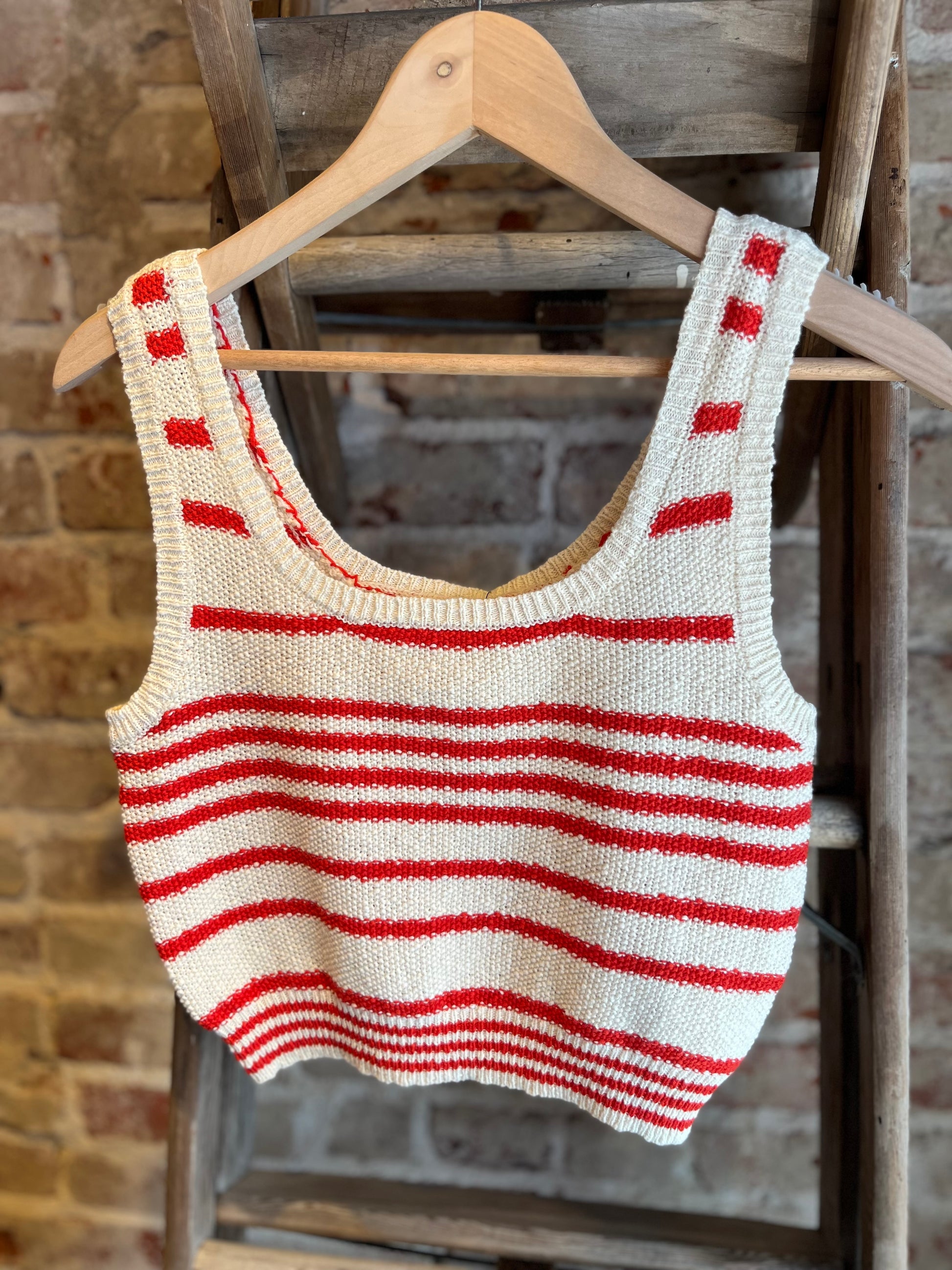 This classic and timeless, knit cotton crop tank top is perfect for everyday wear. The round neckline, sleeveless design, and cropped length create a simple and versatile silhouette. The horizontal striped pattern adds a touch of interest and style. The ribbed knit construction offers a comfortable and textured feel. This top can be dressed up or down, making it a versatile piece for any wardrobe.