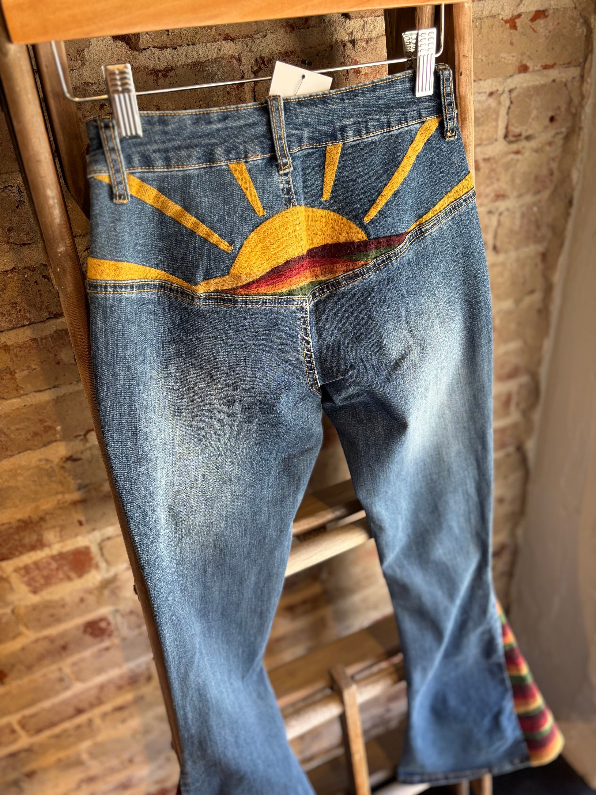 Best Seller! The cutest pair of denim with a sunrise embroidered on the back and embroidery in sunrise/sunset colors on the pant leg! These always get compliments & bring a smile!