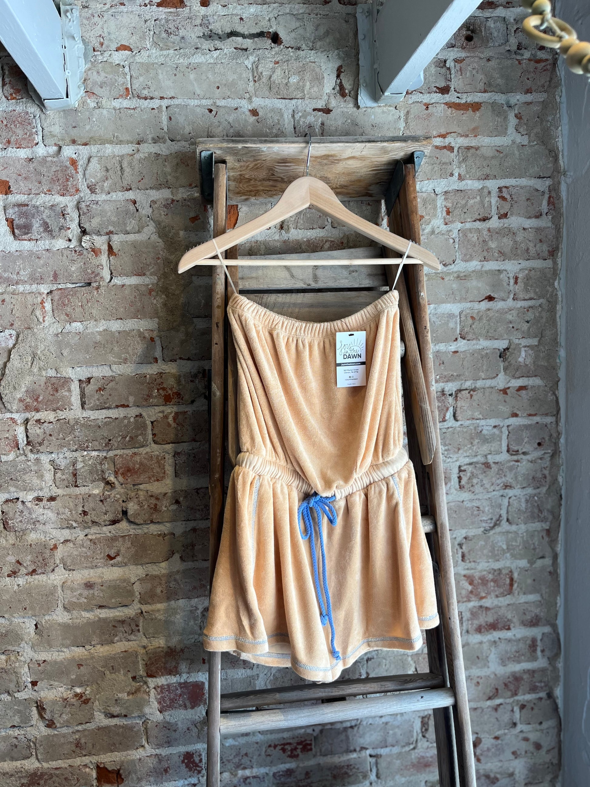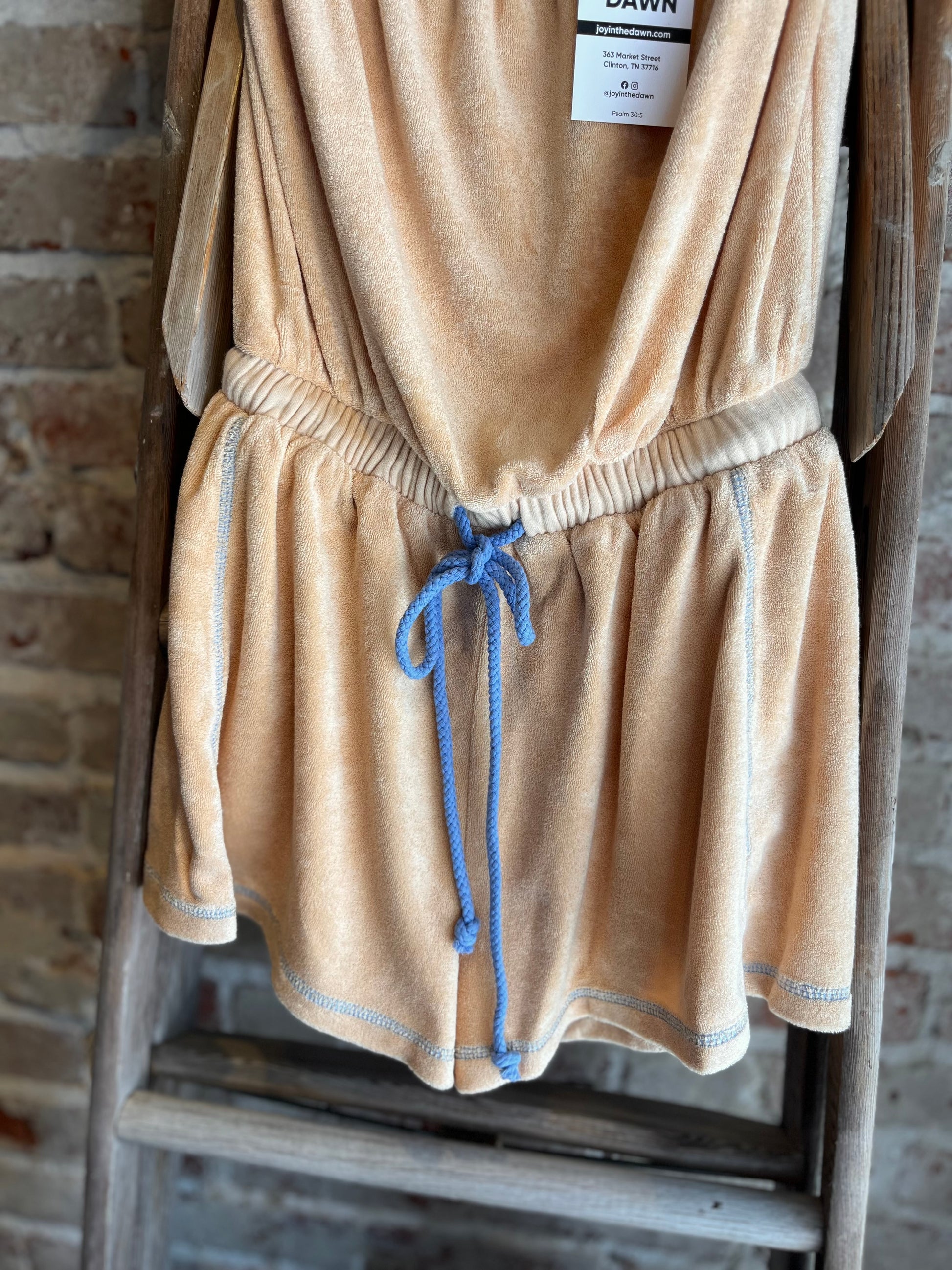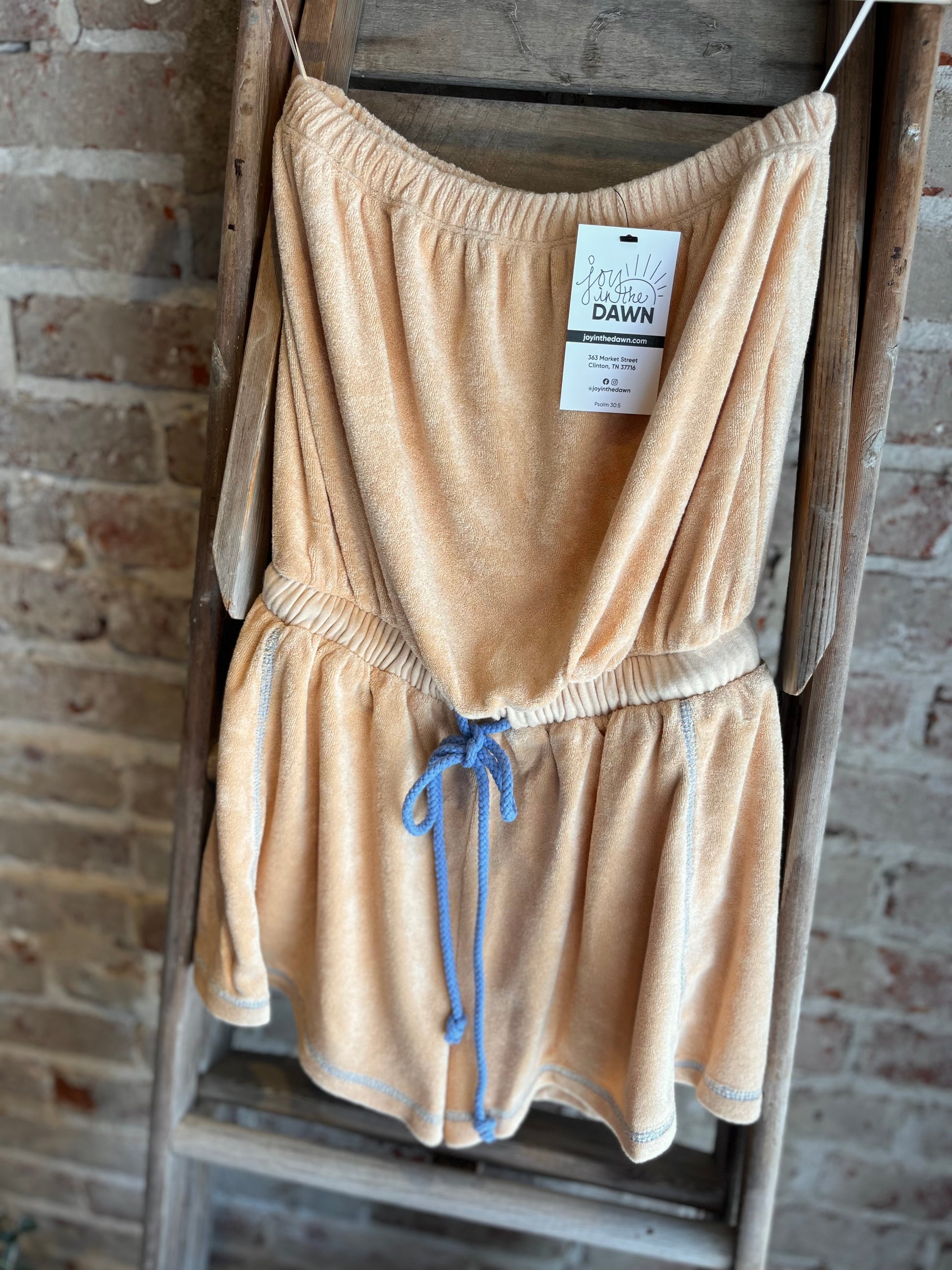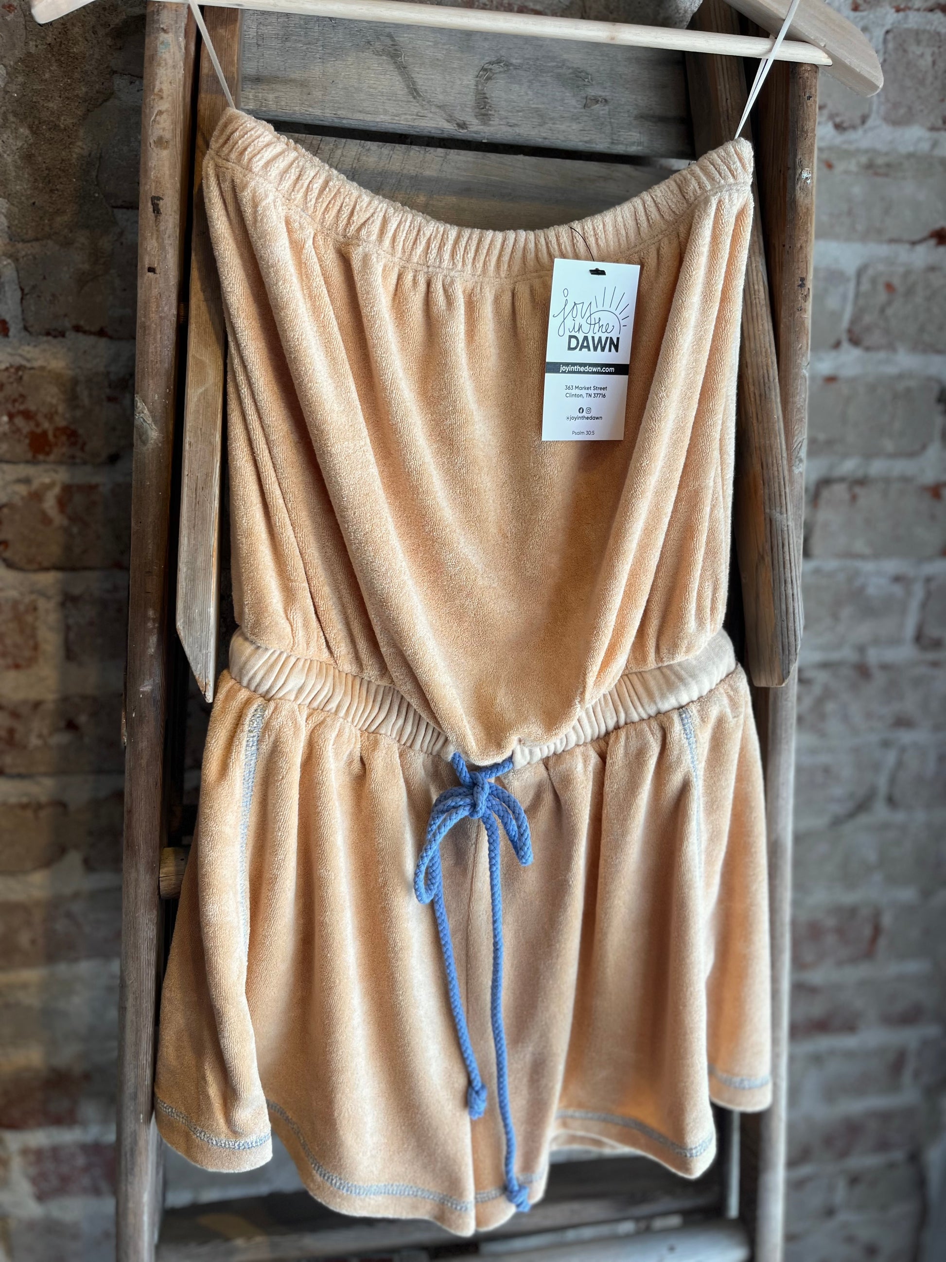 Experience comfort and style with this Terry Cotton Tube Top Peach Romper! So fun and casual for all summer long! Cute as an outfit or as a cover up!