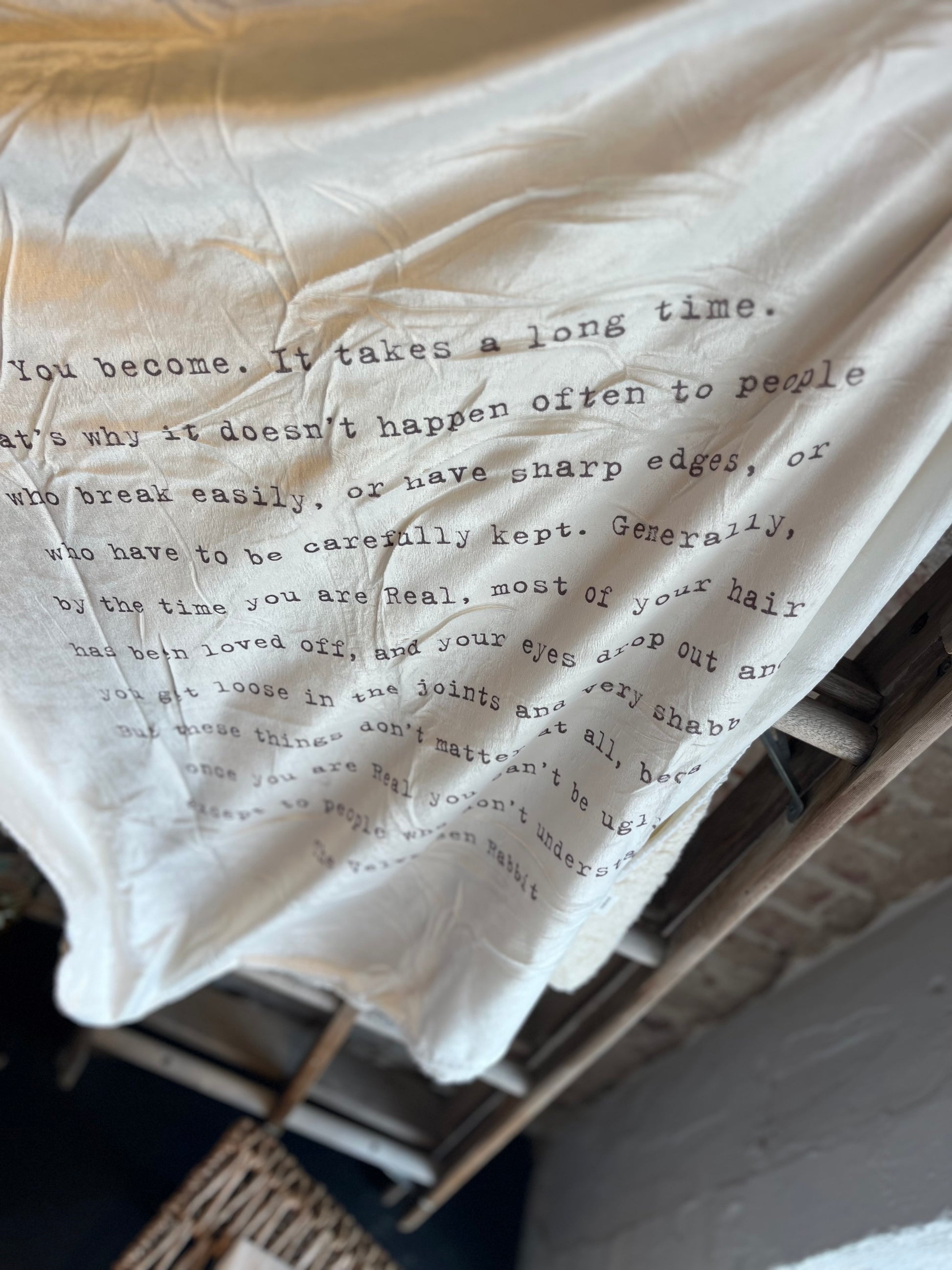 An excerpt from a popular children's book, The Velveteen Rabbit, is printed this baby blanket to remind those who read it that it doesn’t matter what people think, you are perfect the way you are.