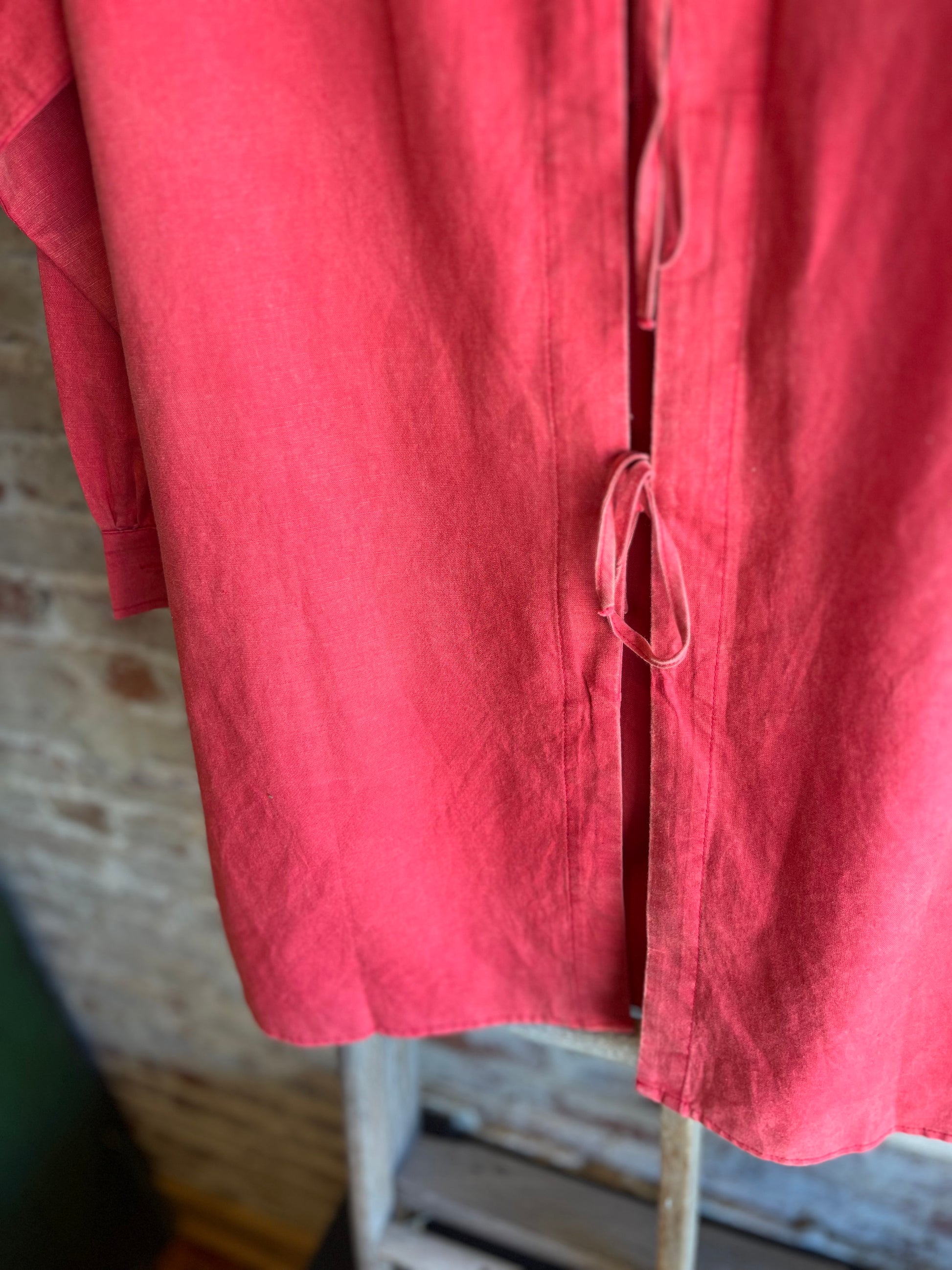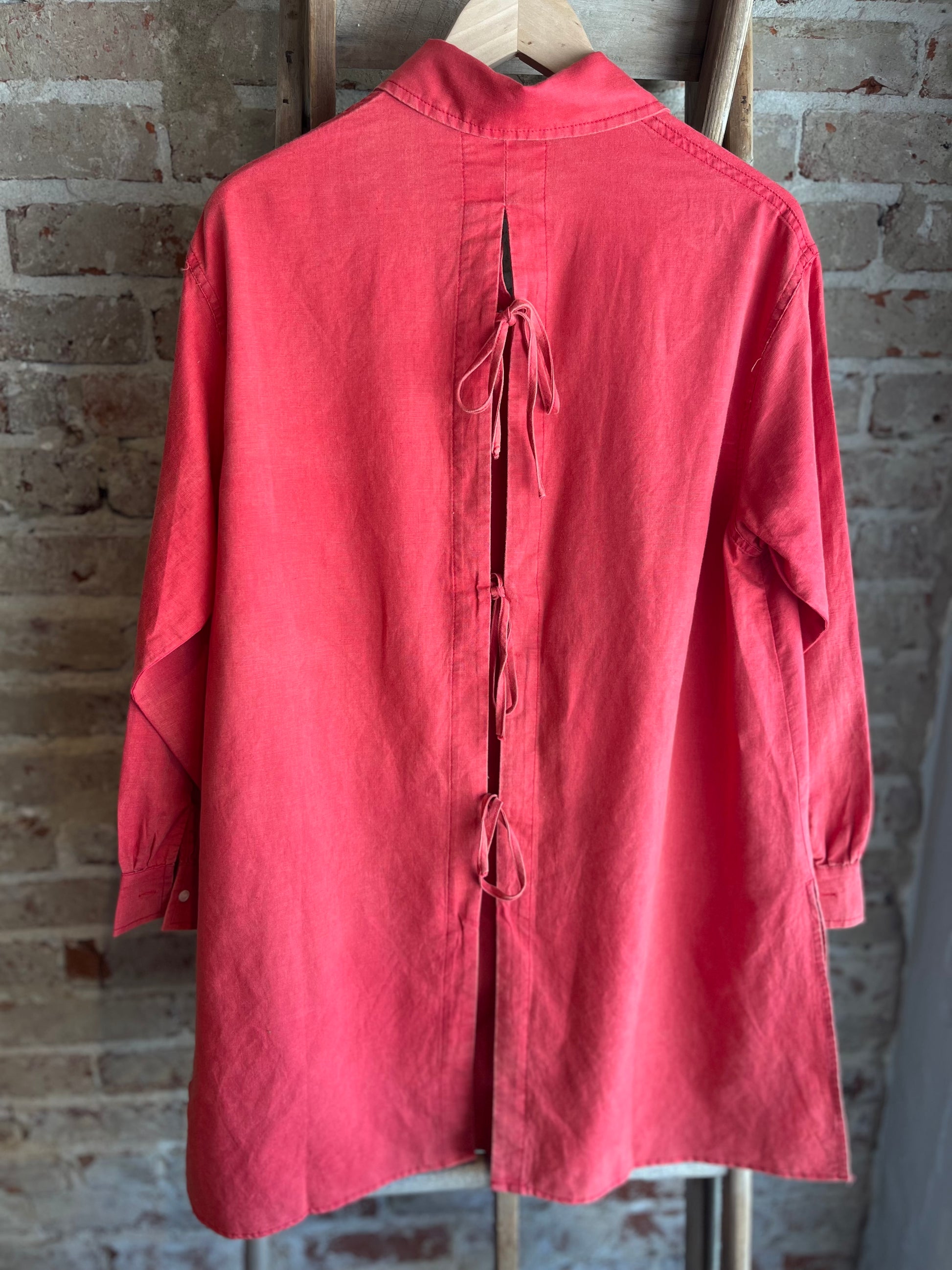 This amazing red button up has a classic look in the front with a tunic length and side splits, but the back takes it to the next level with the triple tie back. It is a mineral washed fabric which we love. Super fun & unique. Perfect with jeans, leggings or even shorts on warmer days.