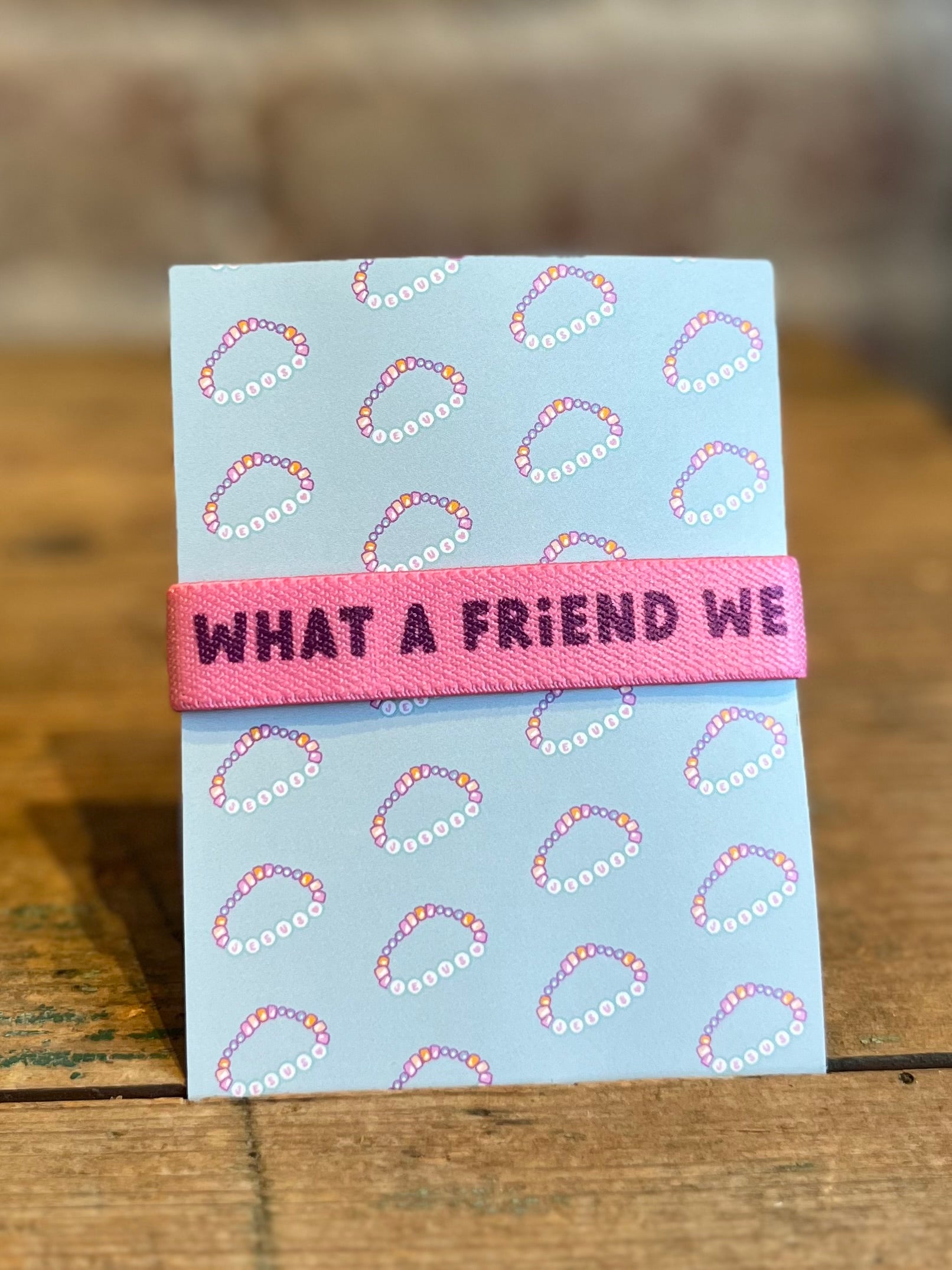 Details: Double-Sided Polyester Elastic Wristband Artwork printed on one side. "What a friend we have in Jesus" printed on other side. 3" before stretching.