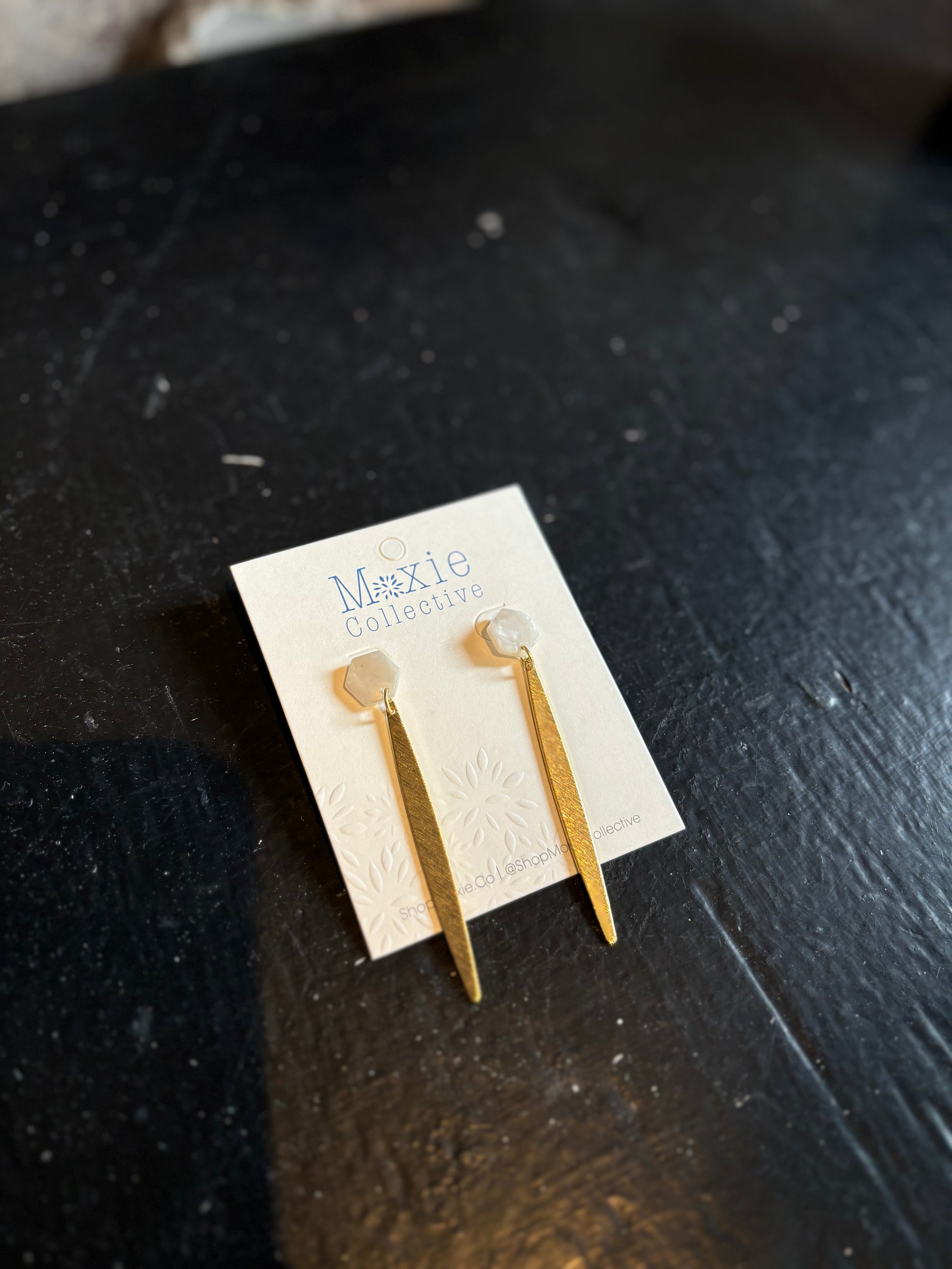 White hexagon earrings feature brass strip charms with stainless steel posts and gold plated components.