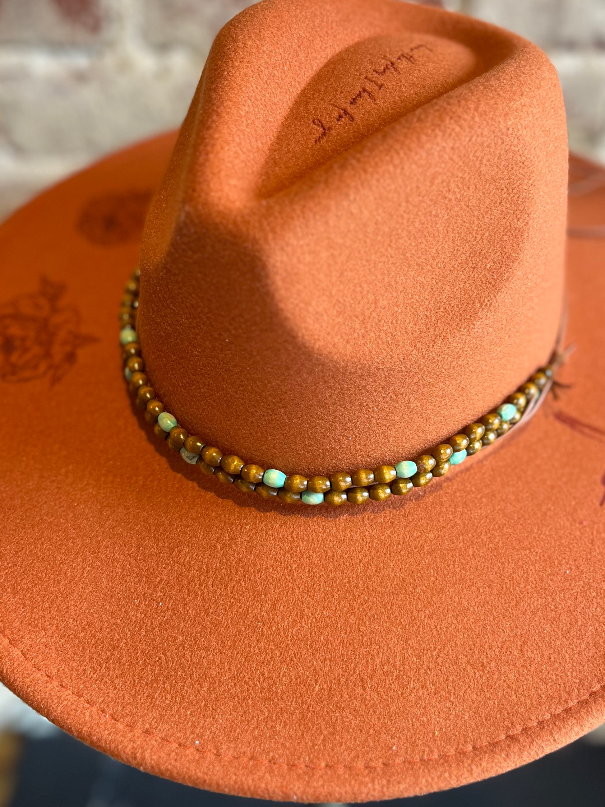 We cannot get enough of this beautiful hat band! Multicolor wooded beads adorn this multi textured hat band.